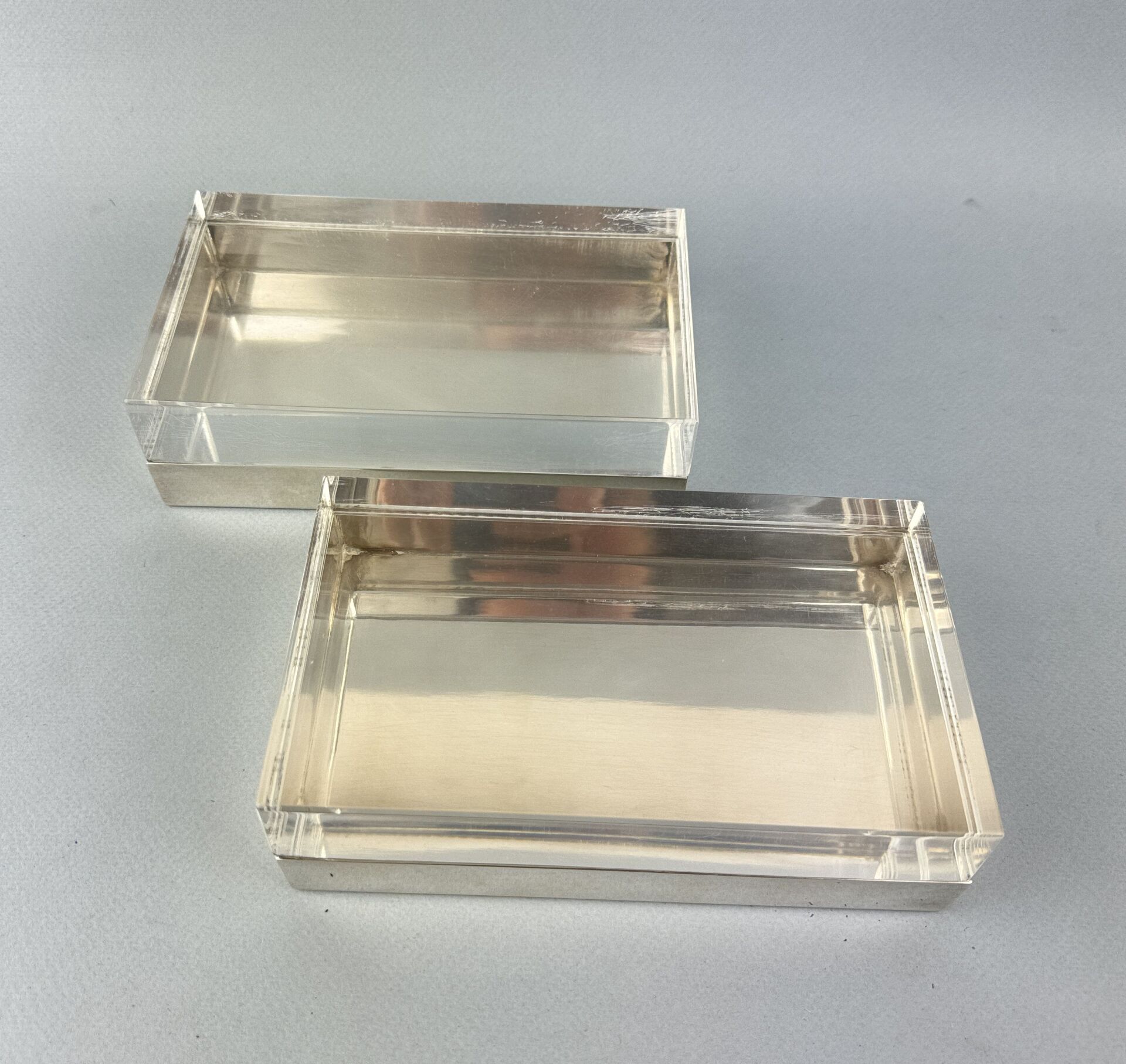 208 RÉSULTAT: 200 € ESTIMATION: 150 / 200 € CHRISTOFLE Paire de boites rectangulaires en métal argenté, le couvercle en plexiglas Un angle de chaque boite légèrement dessoudé H : 5 – L : 17 – P : 10 cm