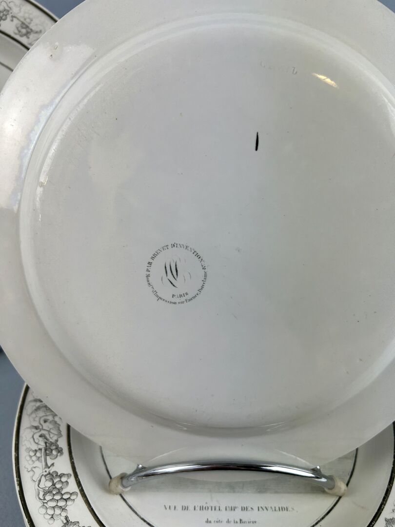 Suite de sept assiettes en faïence blanche à décor en grisaille de vues de monuments de Paris