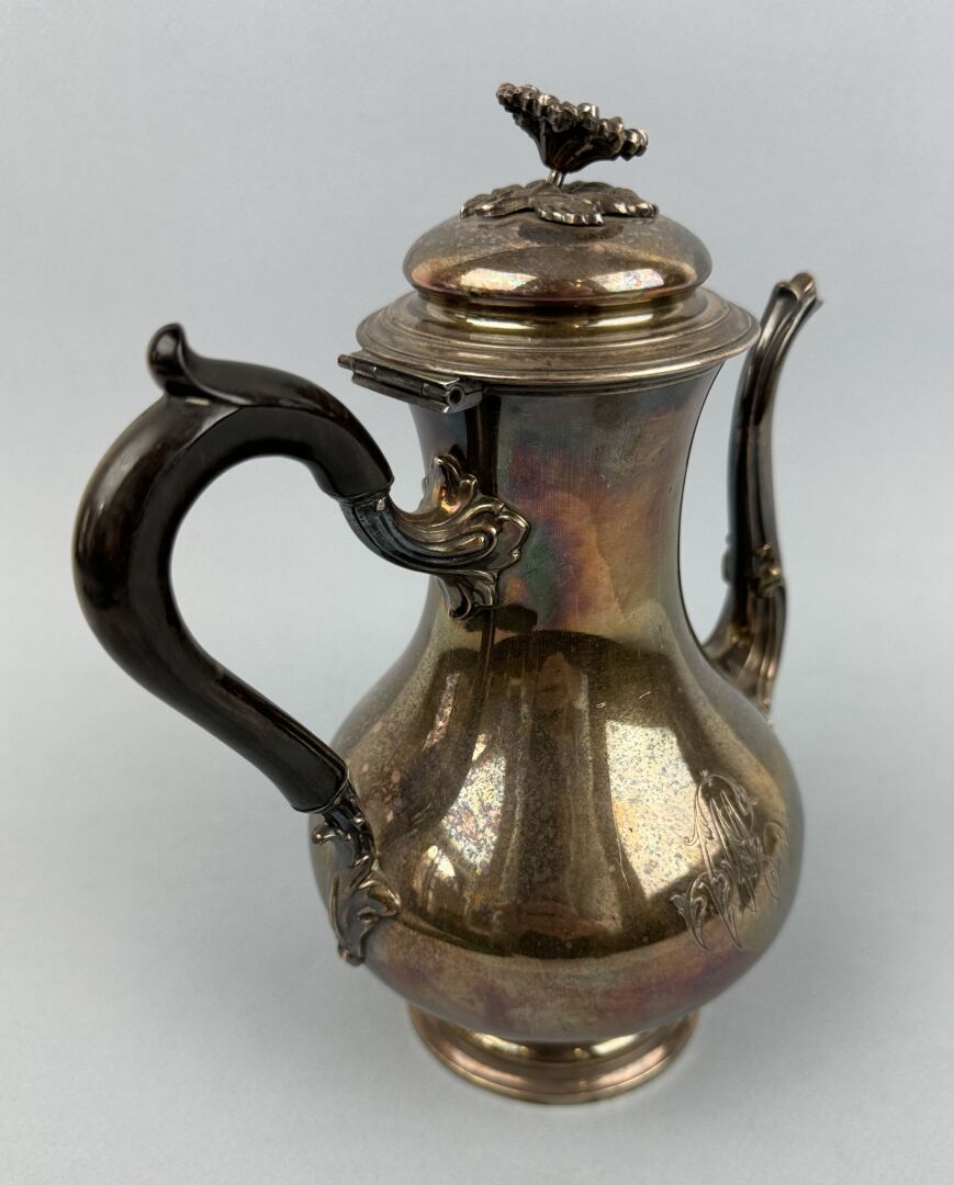 87 RÉSULTAT: 220 € ESTIMATION: 100 / 150 € Grande verseuse en argent, poinçon Minerve, chiffrée « CM », la prise figurant une fleur épanouie, anse en bois vernis Maître Orfèvre : Henri Soufflot (activité 1884-1910) Petit choc Poids brut : 455 g