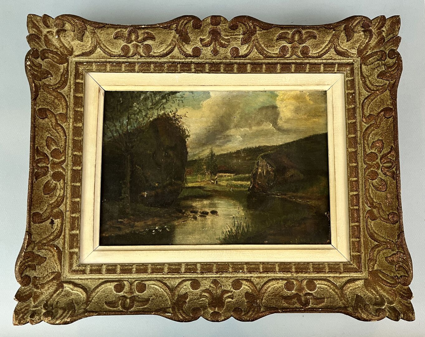 105 RÉSULTAT: 20 € ESTIMATION: 50 / 80 € École Française XIX° Paysage animé Huile sur toile, portant une signature en bas à droite et dédicacée et datée au dos 1880, petits accidents 24,5 x 35 cm