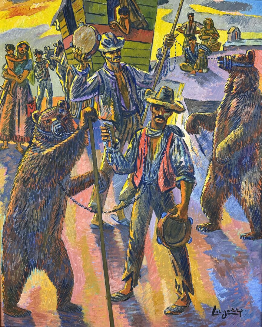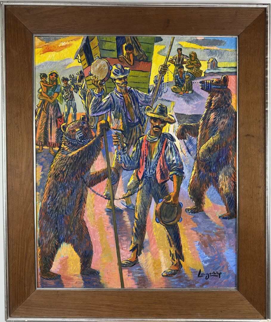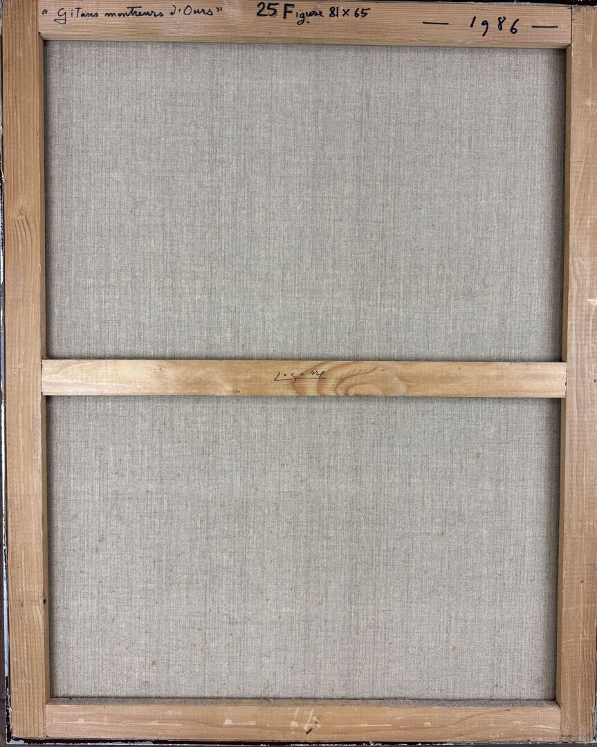 115 ESTIMATION: 1800 / 2000 € René Gaston LAGORRE (1913-2004) Gitans montreurs d’ours Huile sur toile signée en bas à droite, contresignée, titrée et datée 1986 au dos 81 x 65 cm