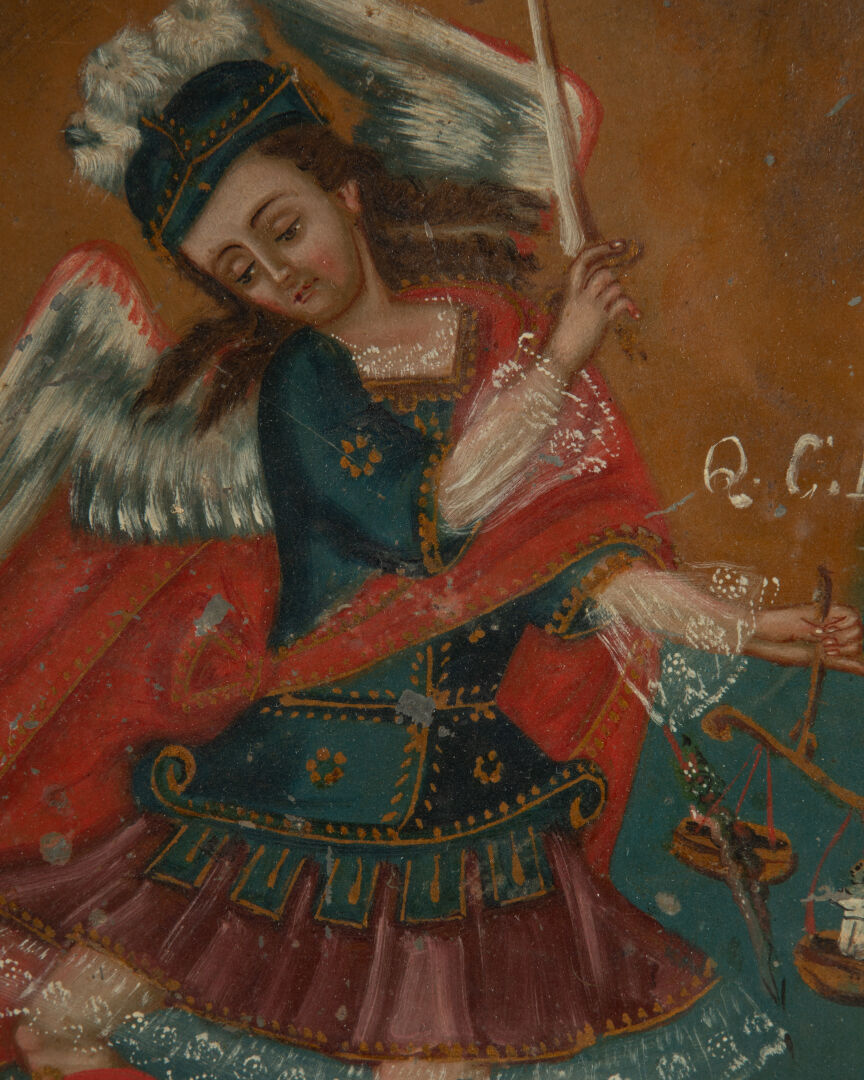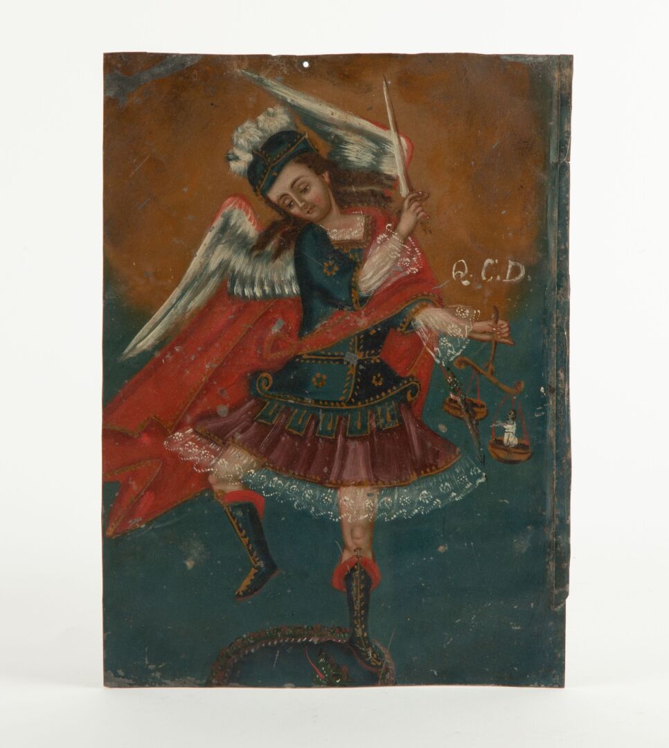 131 ESTIMATION: 200 / 300 € École de Cuzco XIX° Archange à la balance Huile sur plaque de zinc Sauts de matière et déformation 30 x 22 cm