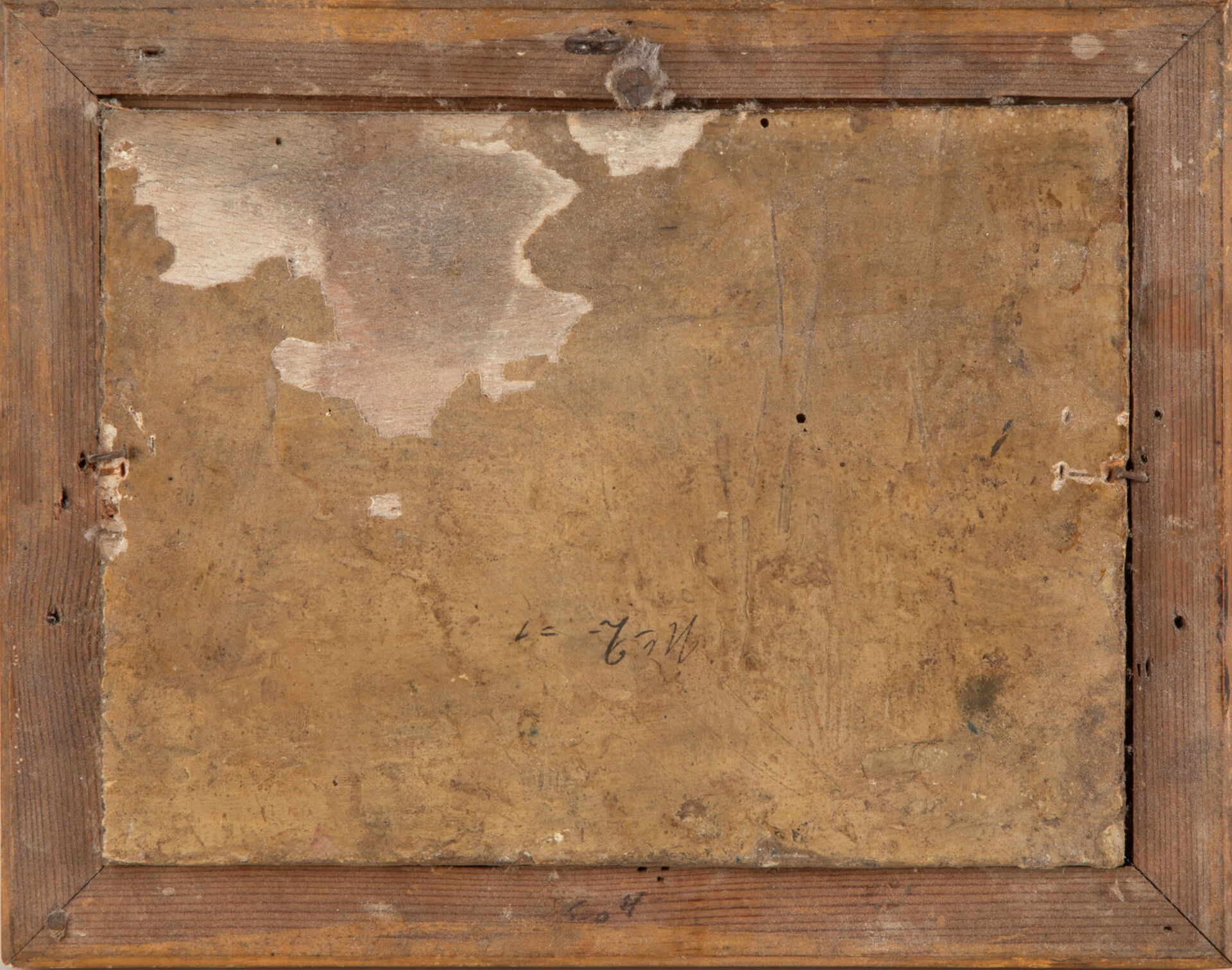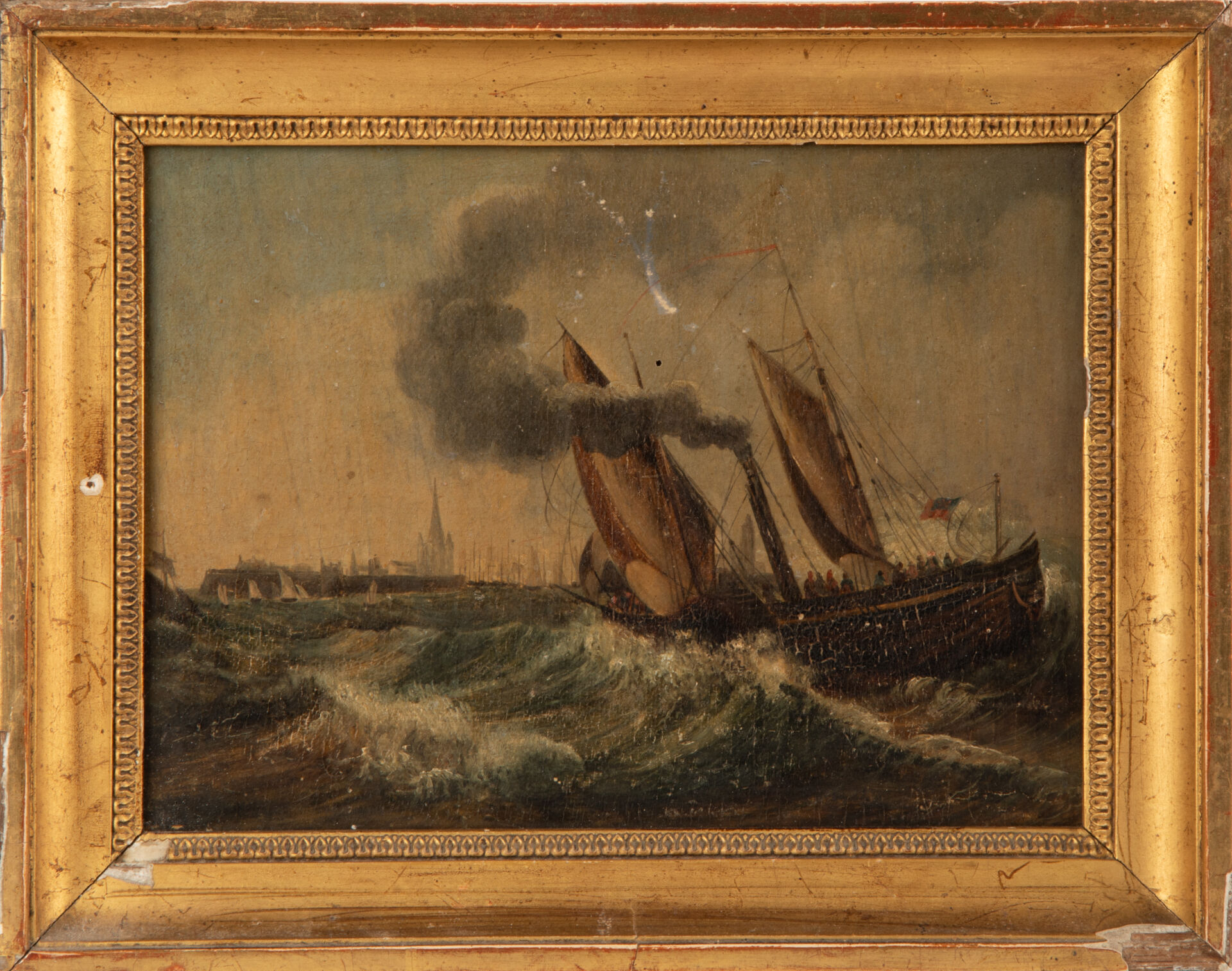 140 ESTIMATION: 60 / 80 € Ecole Européenne XIX° Bateaux dans la tempête Huile sur panneau Piqures d’insectes, accidents 15.2 x 20.7 cm