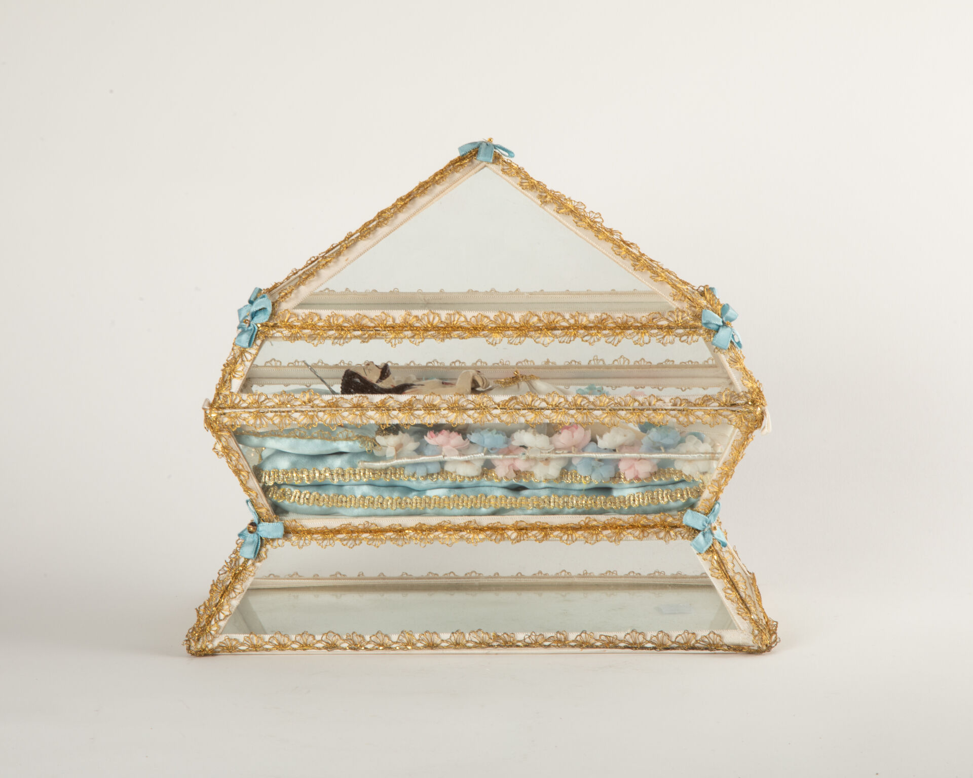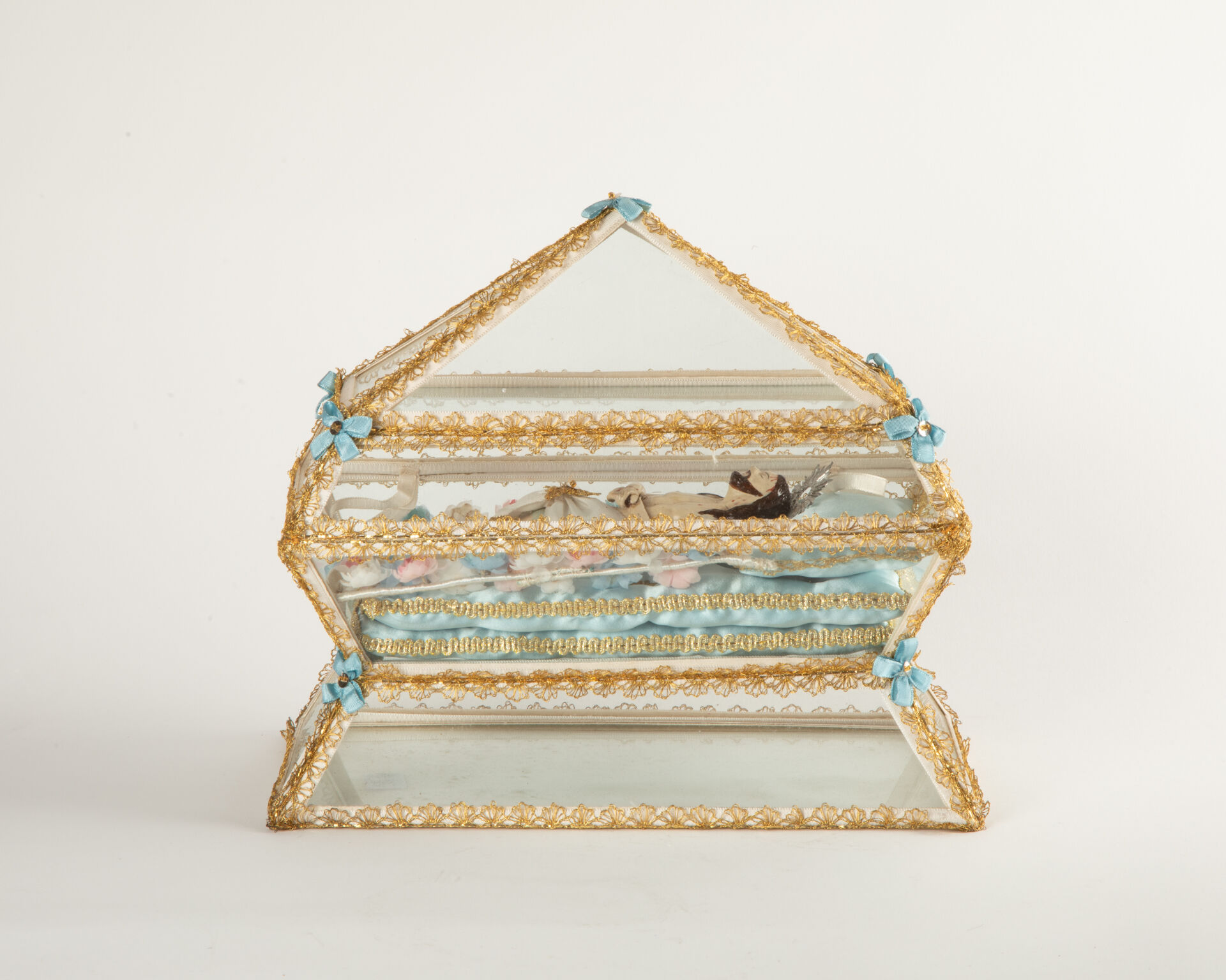 148 ESTIMATION: 80 / 120 € Diorama figurant le Christ au tombeau Sujet en bois peint dans sa châsse en verre, tissus et sequins Travail XIX° H : 24 – L : 28 – P : 13.5 cm