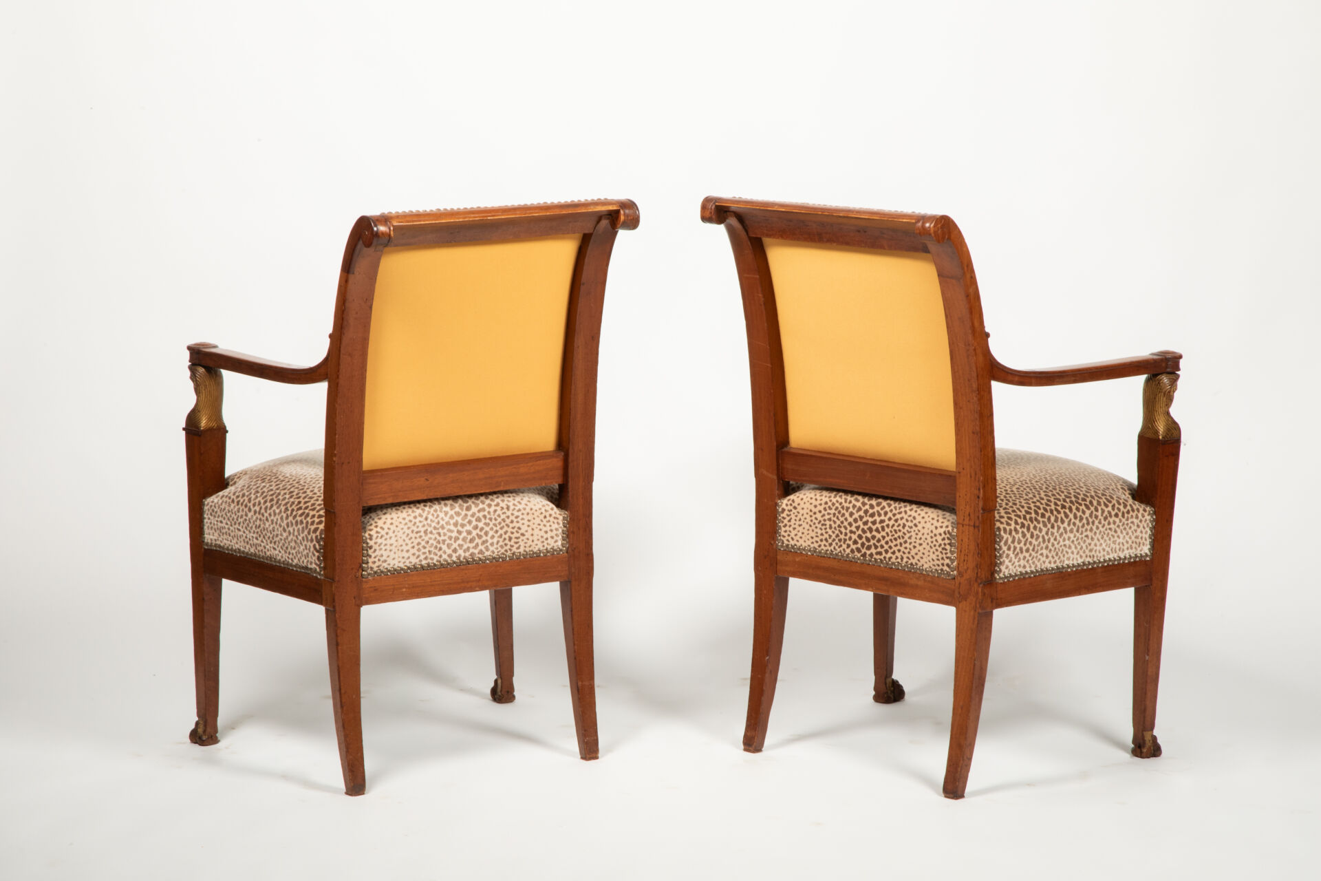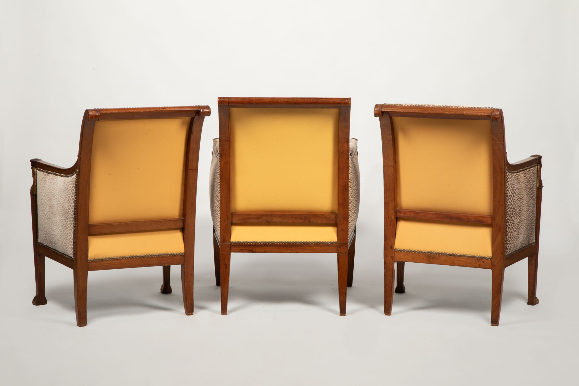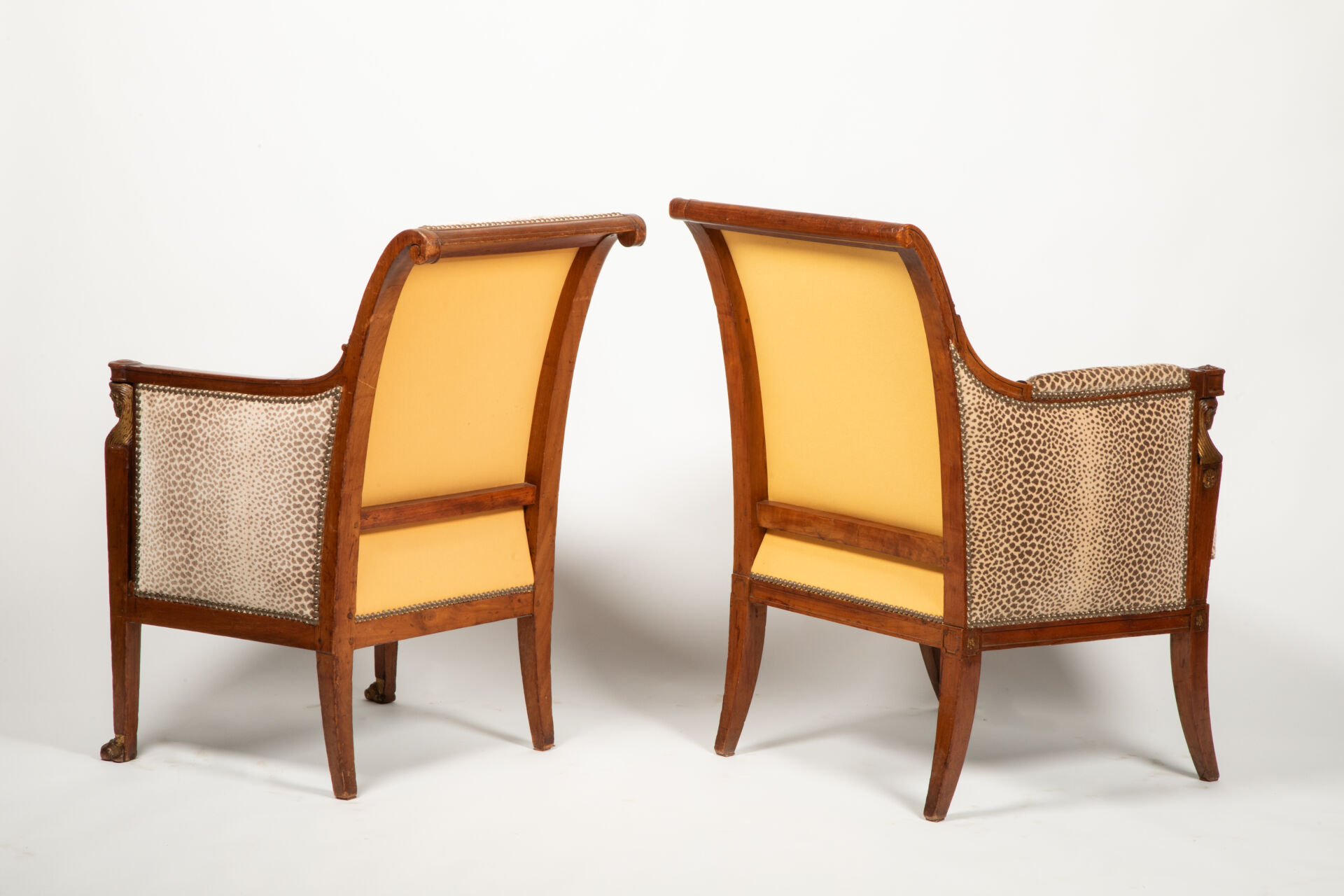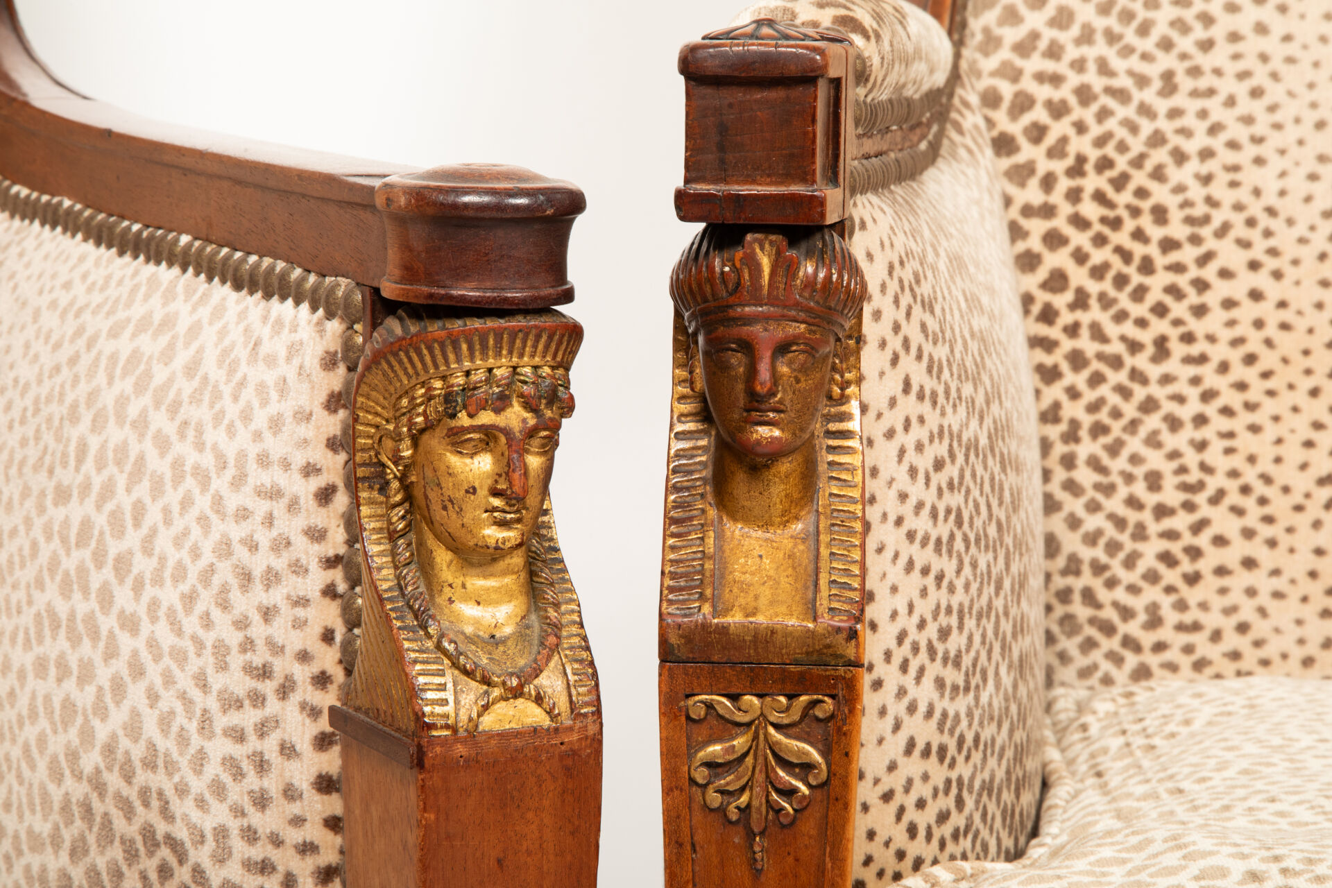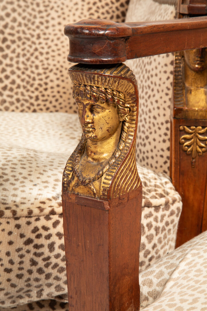 On y joint une bergère en acajou mouluré et sculpté partiellement doré à décor de palmettes, les consoles d’accotoir sculptées de têtes d’égyptiennes dorées reposant sur quatre pieds sabre.