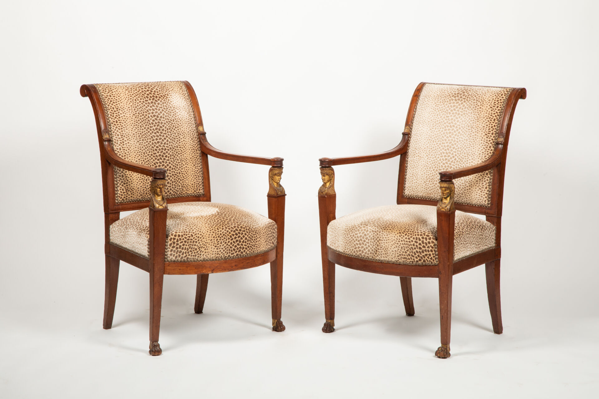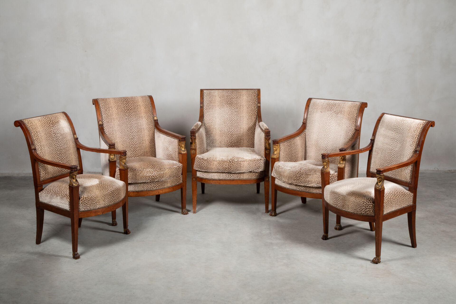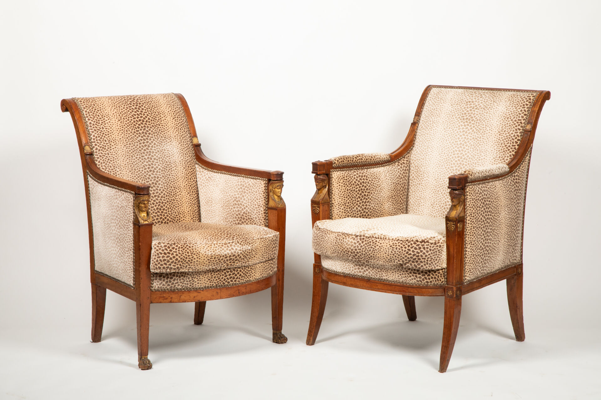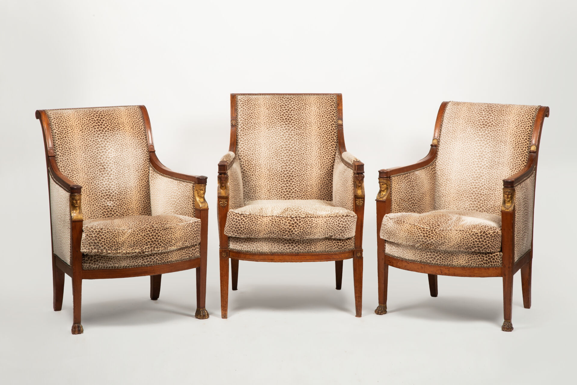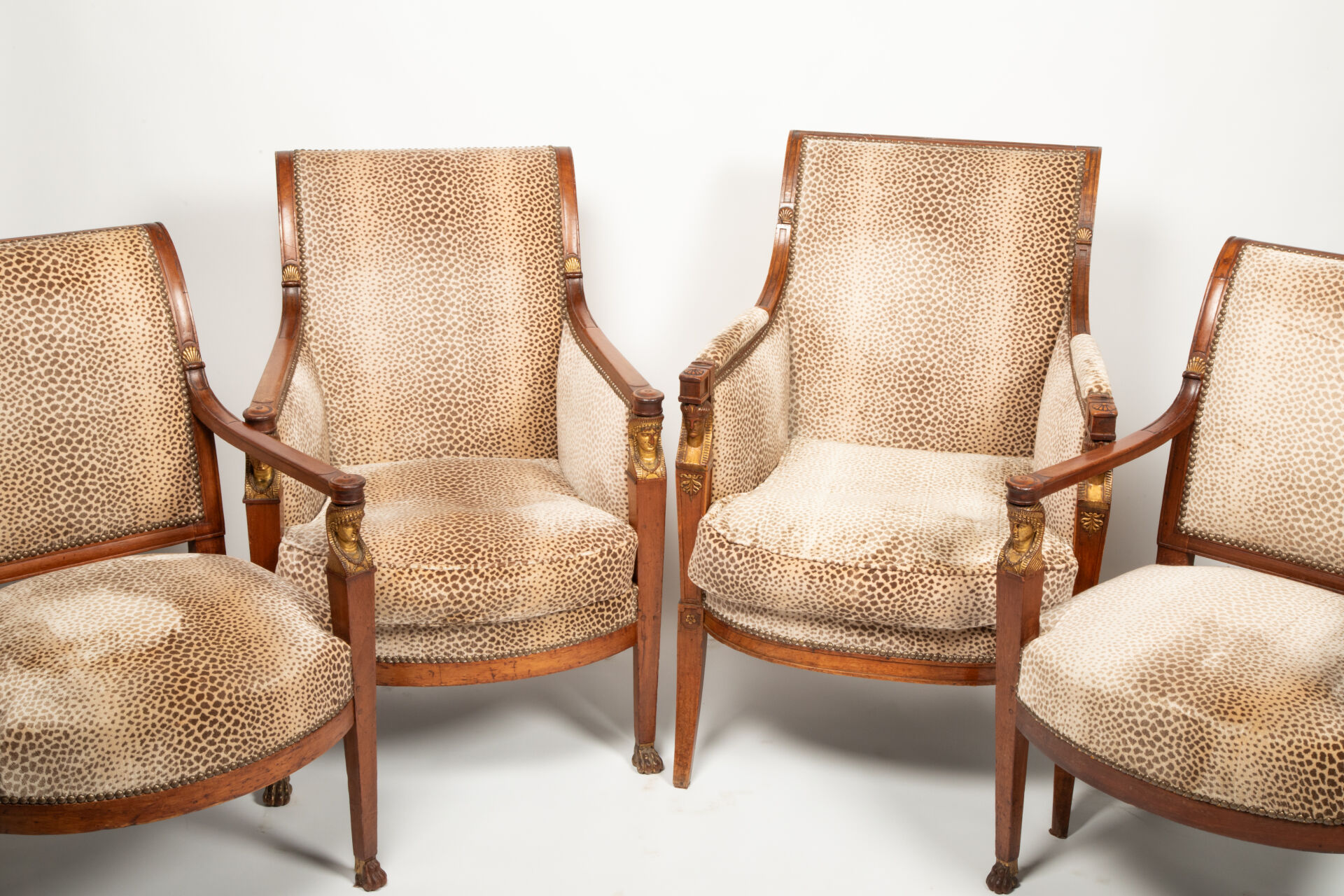 Partie de salon composé de deux bergères et de deux fauteuils en acajou mouluré et sculpté à décor de palmettes dorées, les consoles d’accotoirs sculptées de têtes d’égyptiennes dorées reposant à l’avant sur deux pieds sabres se terminant par des pattes léonines et deux pieds sabres à l’arrière