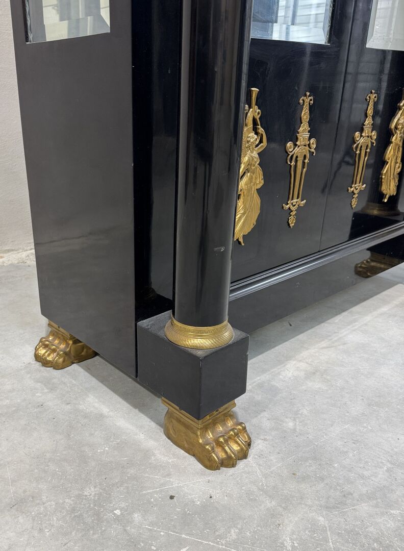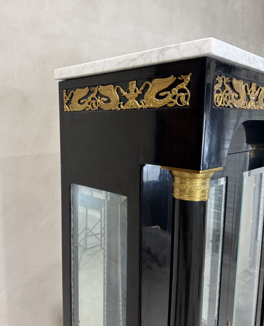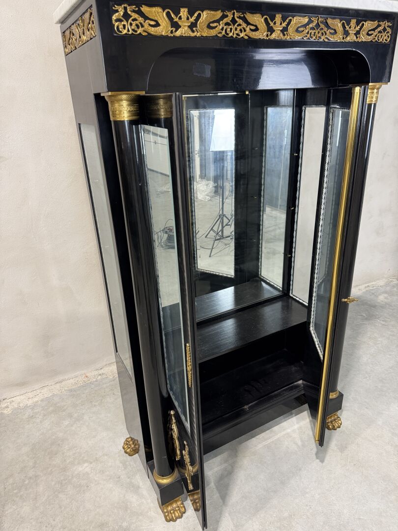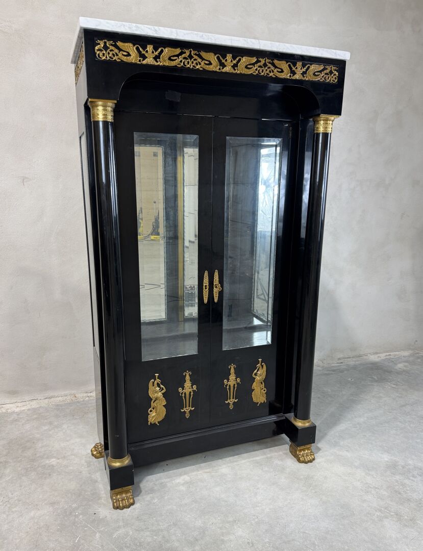 Bibliothèque en placage de bois noirci à deux portes vitrées, ornementation de bronze doré à décor de style Empire, deux colonnes dégagées se terminant par des pâtes léonines en bronze doré en façade et sur les cotés, dessus de marbre blanc