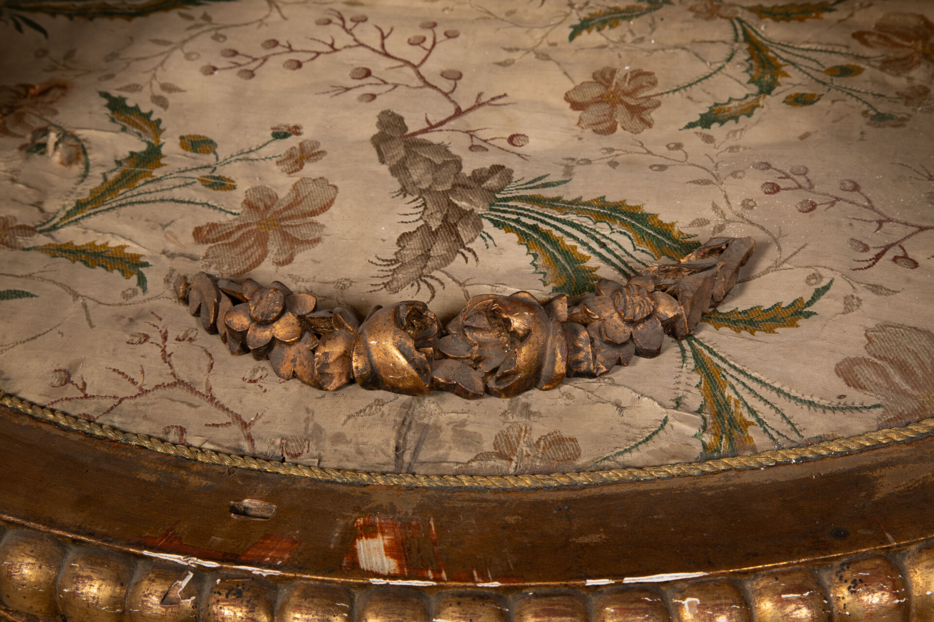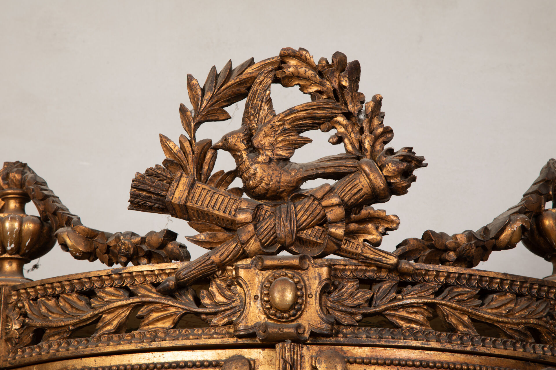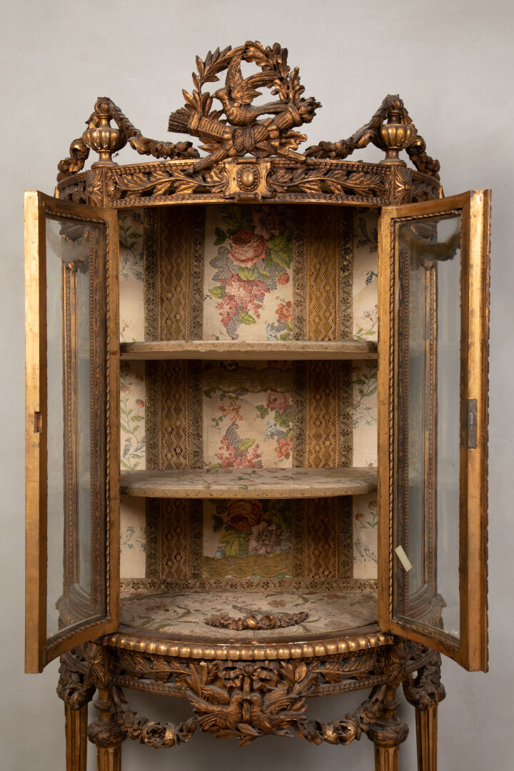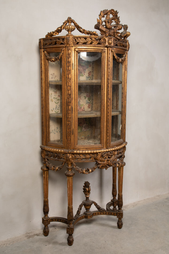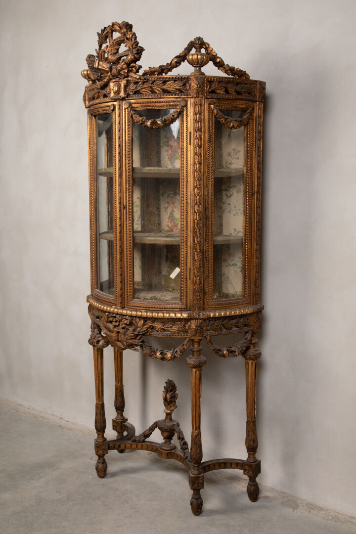 Meuble vitrine de forme demi lune en bois naturel mouluré, sculpté et doré à riche décor de frises de perles, raies de coeur, guirlandes feuillagées, le fronton ajouré à décor de torche, carquois, oiseaux volants, guirlandes feuillagées et pots à feux. le piètement reposant sur quatre pieds fuselés cannelés reliés par une entretoise centrée d’un important pot à feu. Vitrine ouvrant à deux portes vitrées, galbées découvrant deux étagères tapissées de soie brodée (restaurations et accidents à la soie)