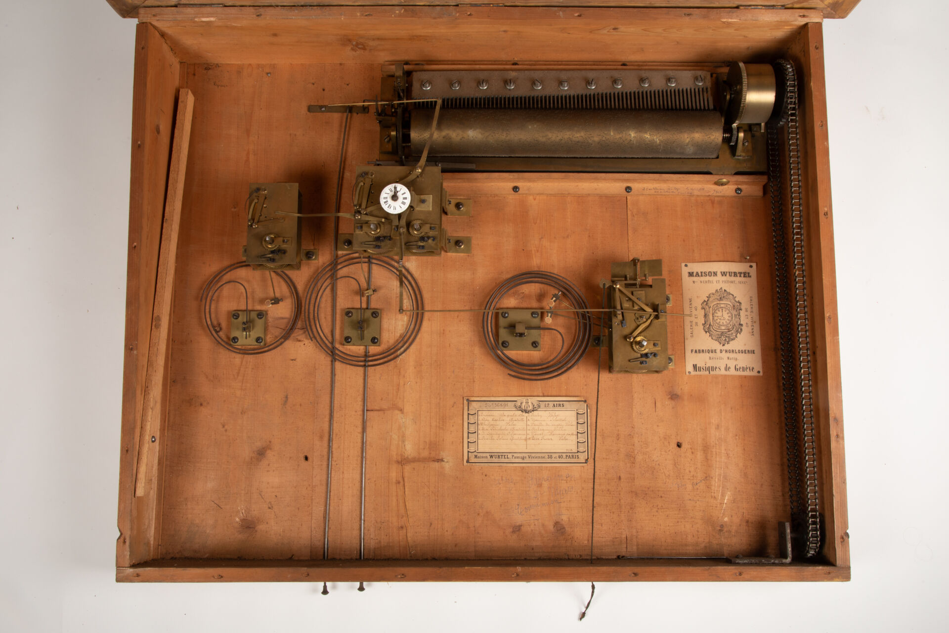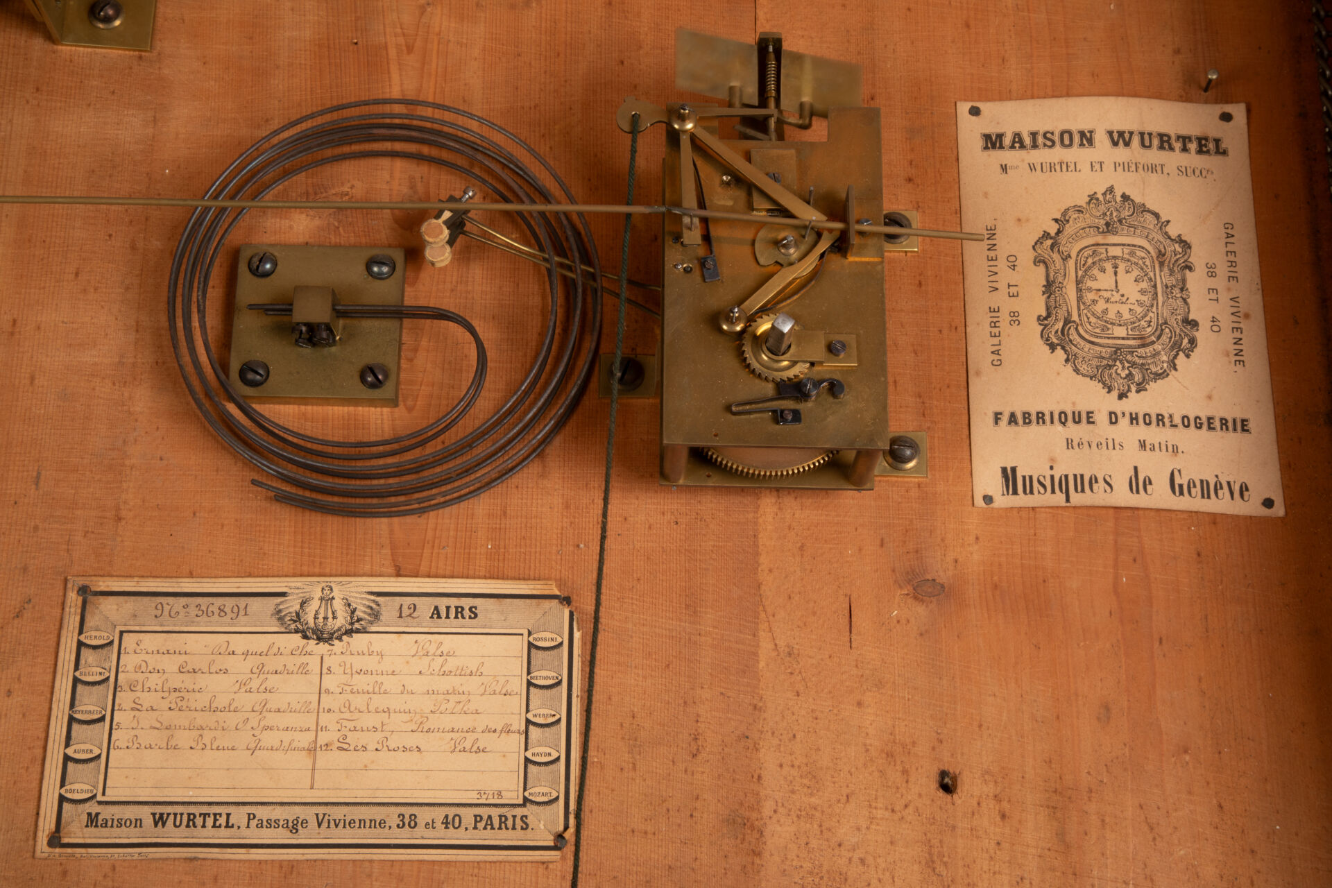 Important tableau horloge, huile sur toile représentant un paysage animé de bord de rivière au clocher, cadran émaillé à chiffres romains. Important mécanisme à quatre éléments dont sonnerie à la demande, cylindre à douze airs dont Barbe Bleue, la Périchole, des valses et divers portant une étiquette de la Maison Wurtel n°36891. Portant également une étiquette Maison Wurtel Galerie Vivienne.