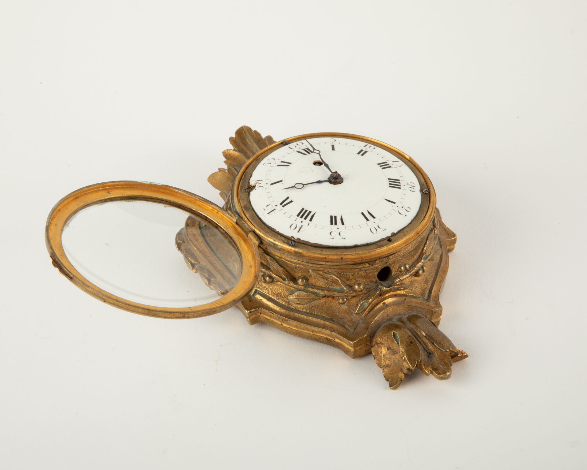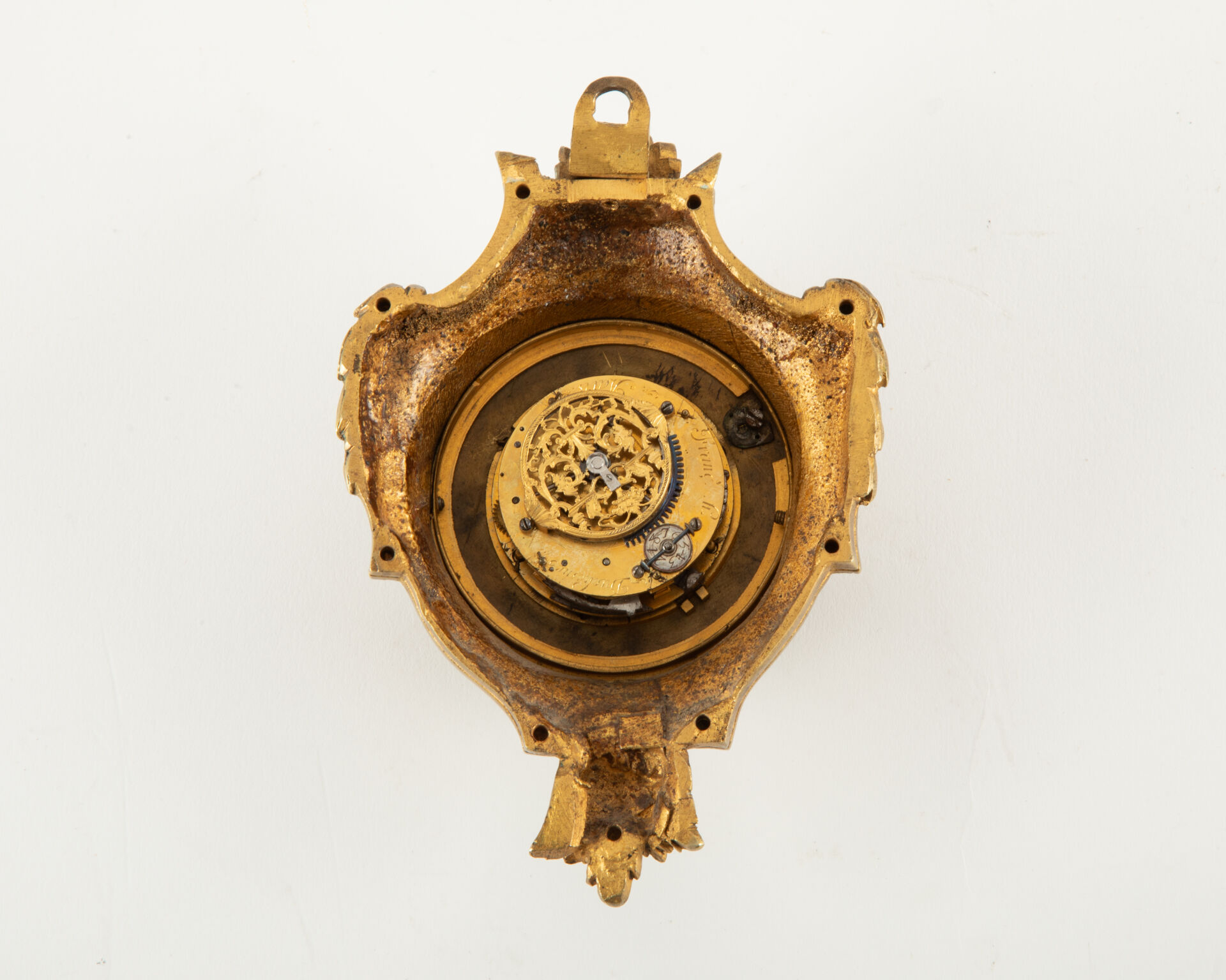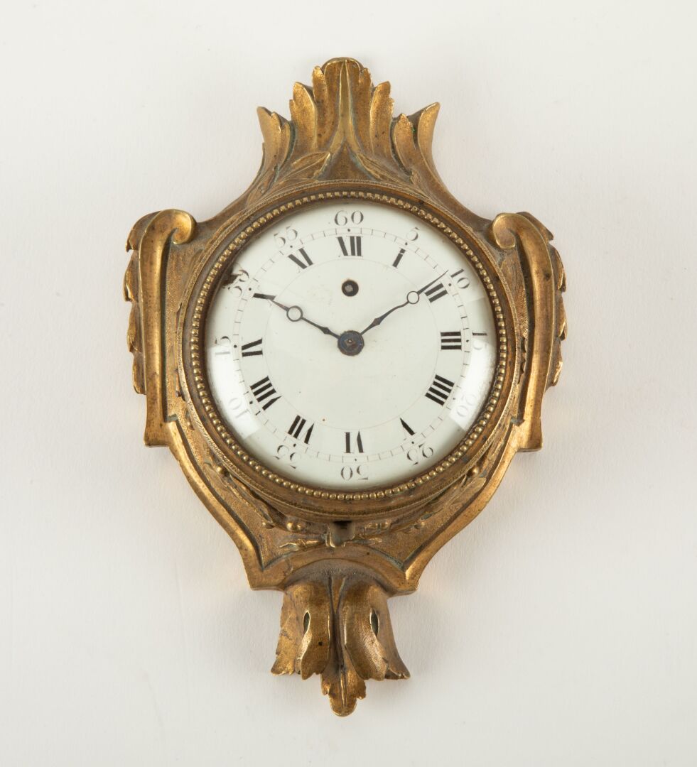 Petit cartel d’applique en bronze doré à décor de frise de laurier et volutes végétales, cadran émaillé blanc chiffre arabe et romain, minute chemin de fer (sauts d’émail), aiguille en acier bleui
