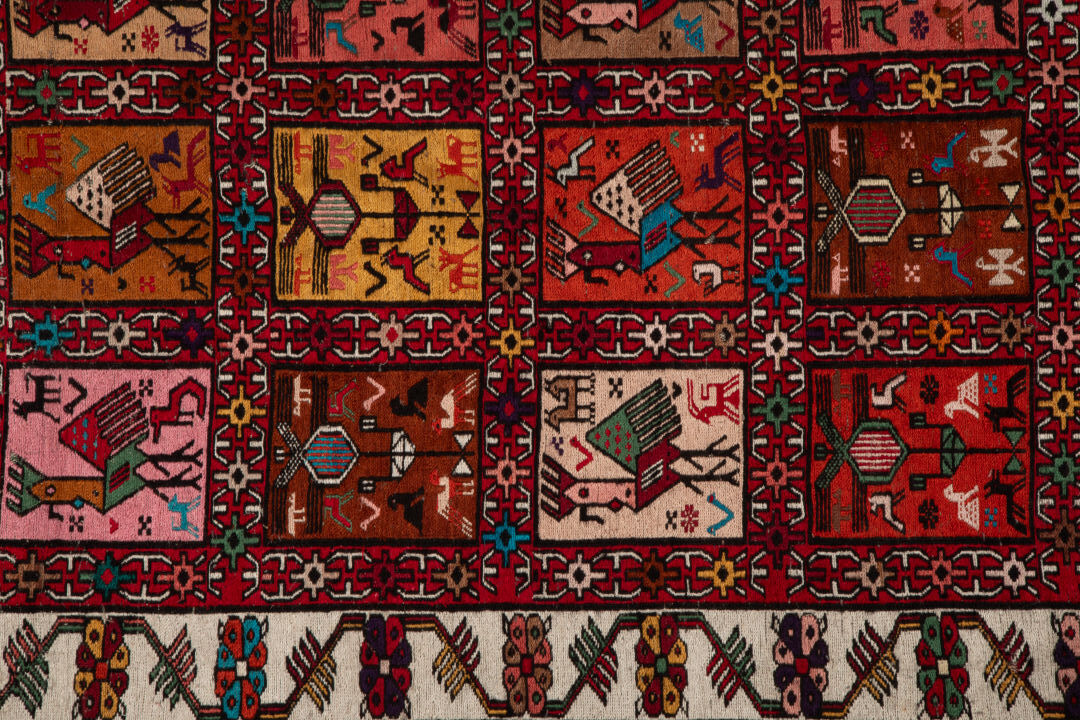 Le tapis est à décor dit de « jardin ». Il est composé de nombreux compartiments rouges, jaunes, oranges, ivoire à oiseaux géométriques.