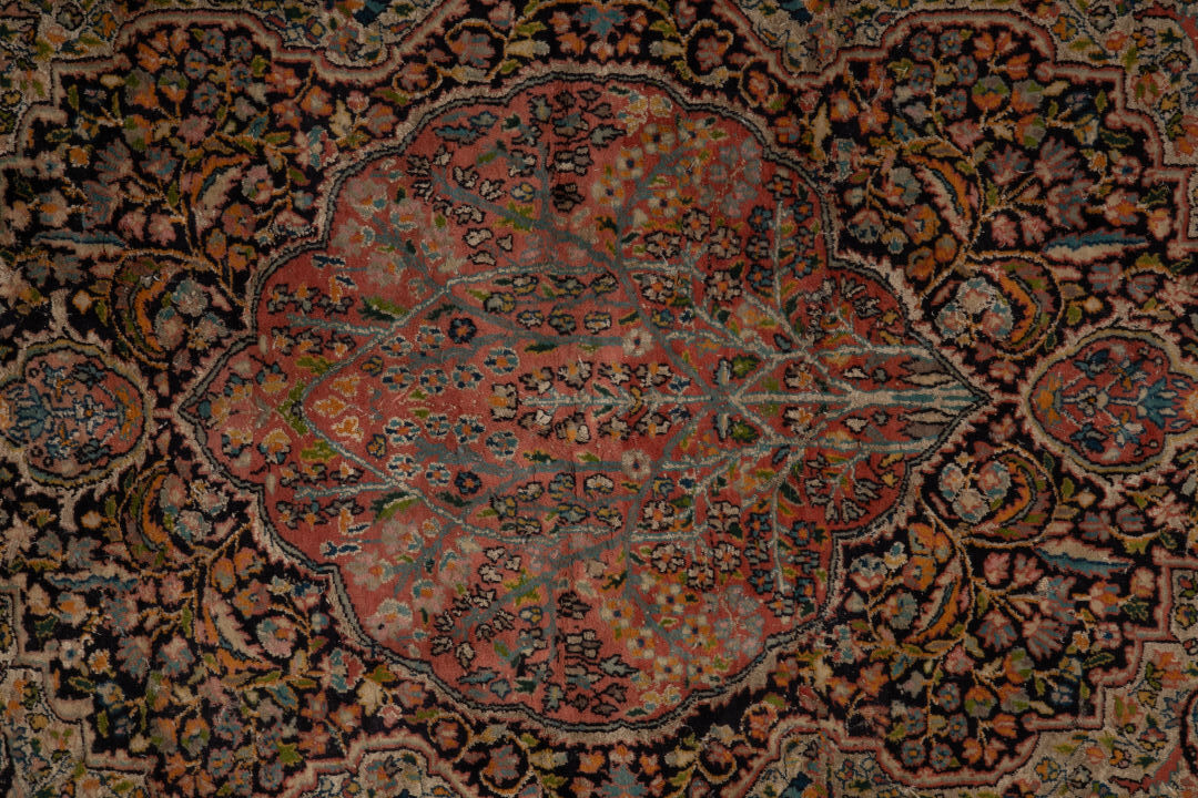 Le tapis est orné d’un médaillon central polylobé rouge, prolongé de deux pendentifs sur fond bleu marine rehaussé d’un élégant décor floral stylisé polychrome. L’ensemble de la composition est agrémenté de quatre coinçons ivoire,