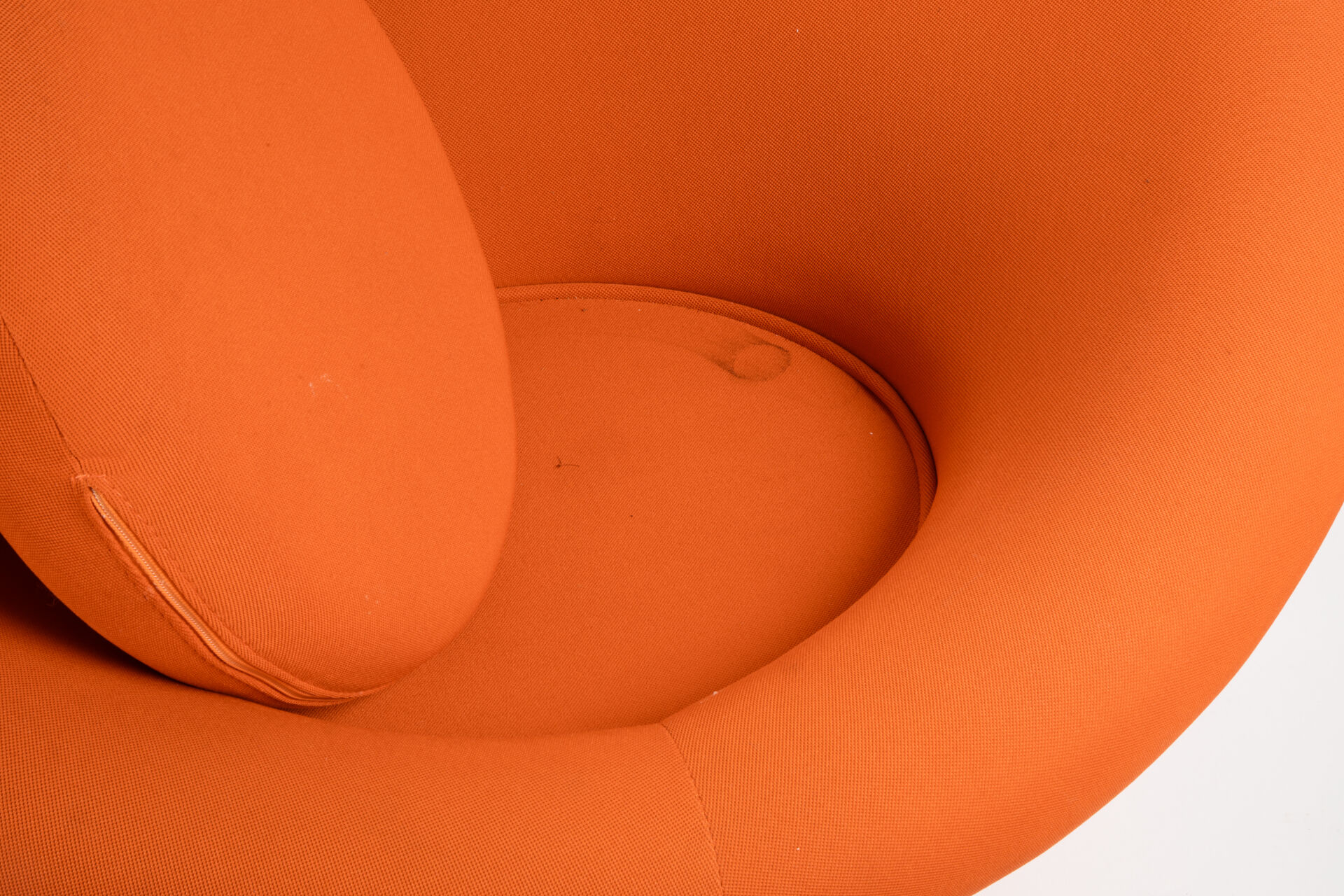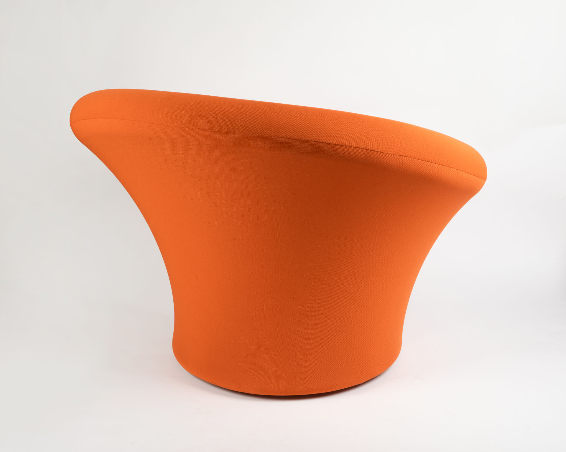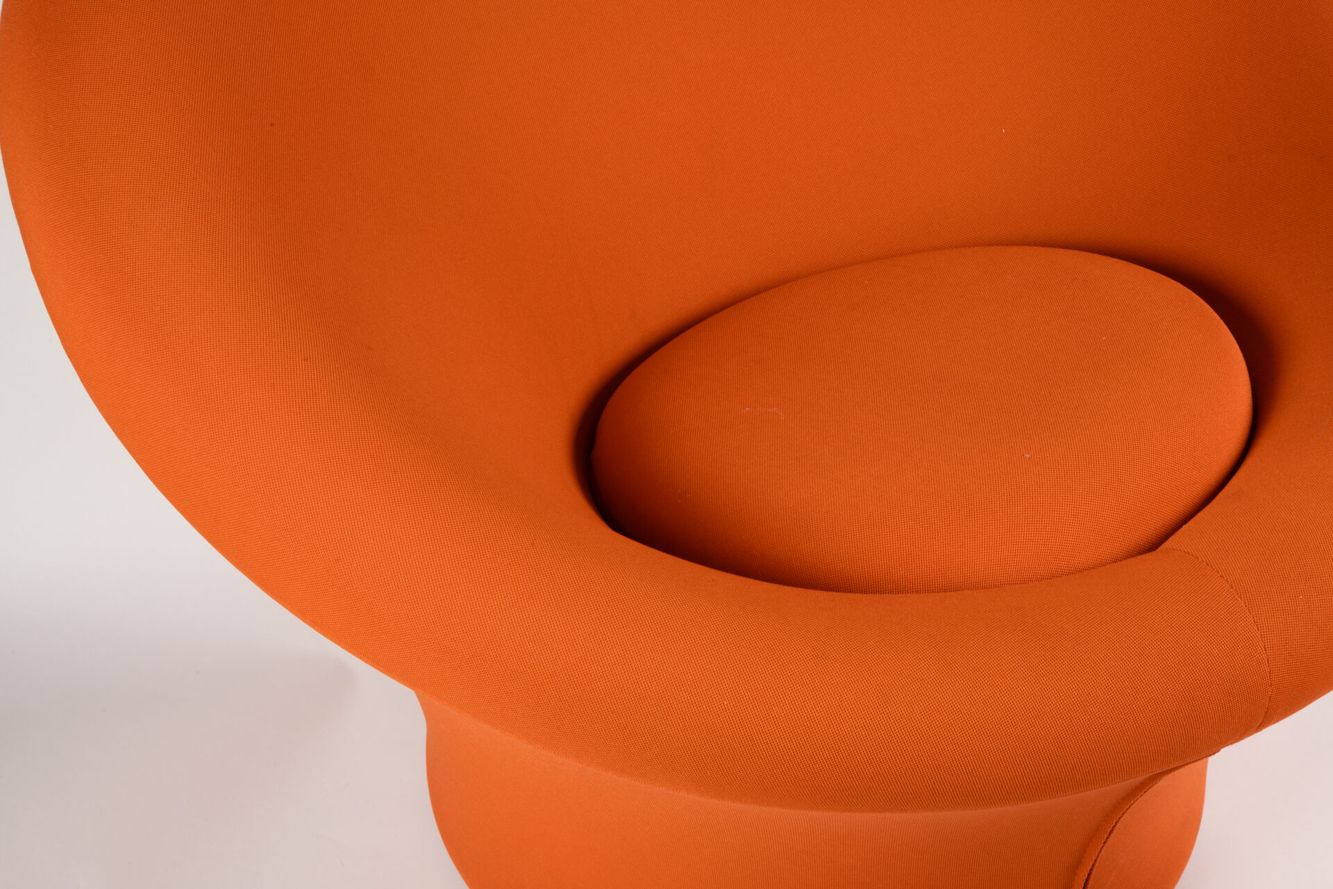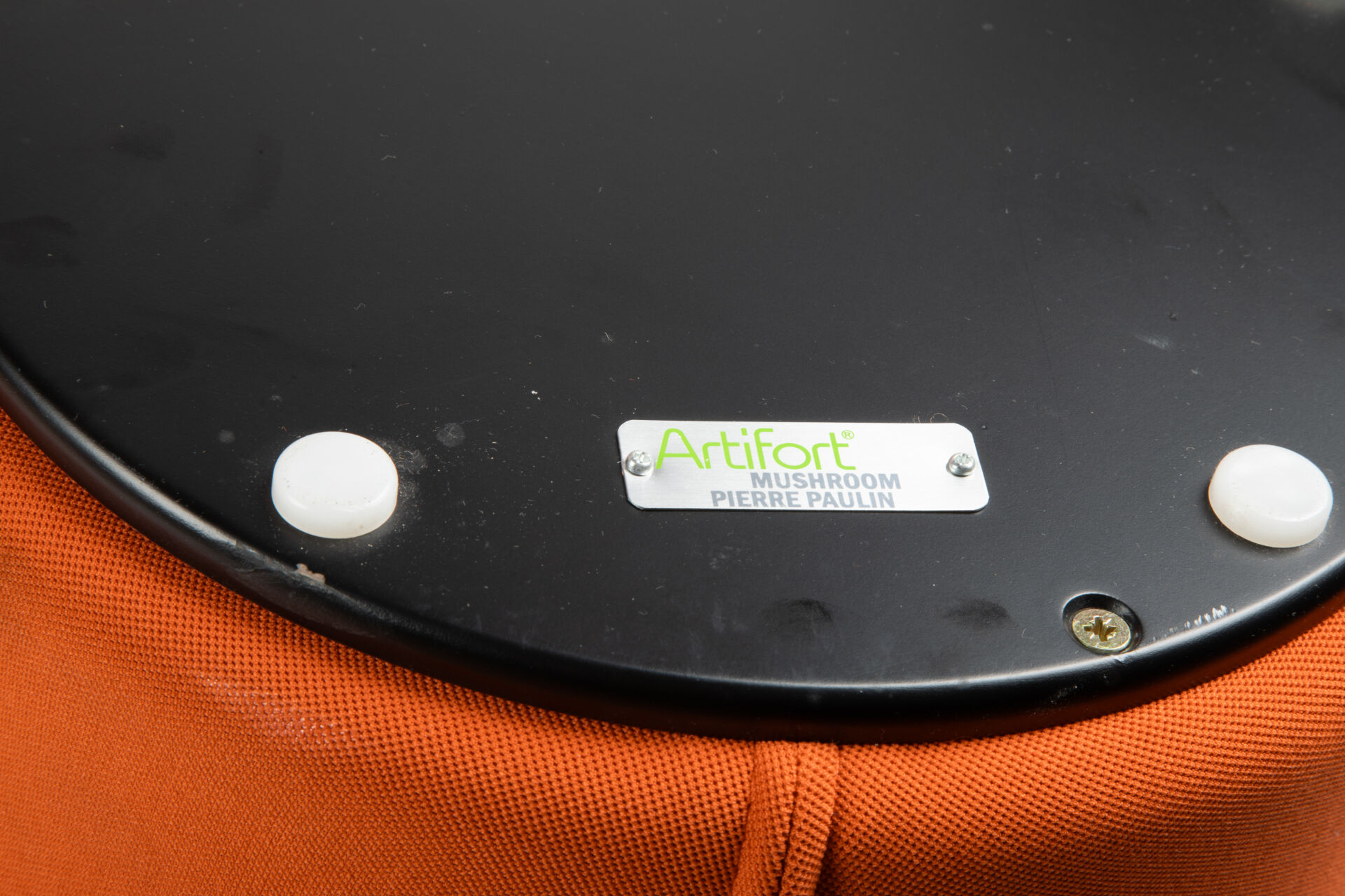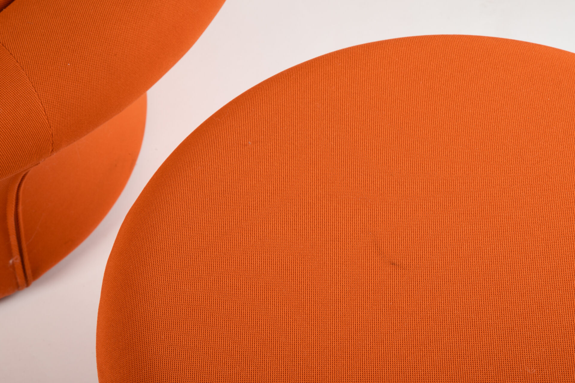 23 ESTIMATION: 800 / 1200 € Pierre PAULIN (1927-2009) – ARTIFORT Éditeur Fauteuil et son ottoman modèle F560 dit « Mushroom », couverture de tissus orange. Plaque de l’éditeur sous la base Tâches H. Fauteuil : 68 cm