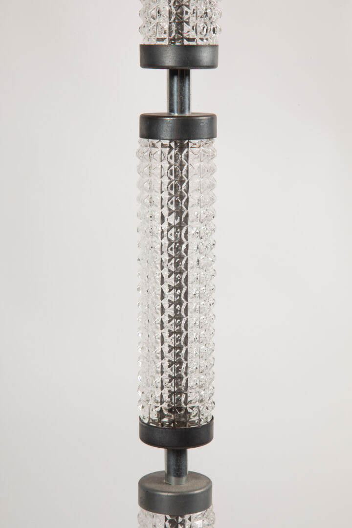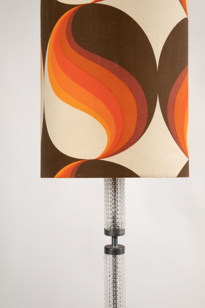 28 ESTIMATION: 150 / 300 € Lampadaire à fût orné d’éléments cylindriques en verre à décor pointe de diamant dans le gout de Murano, abat jour tendu de tissus polychrome Travail des années 1970 H : 181 cm avec abat-jour