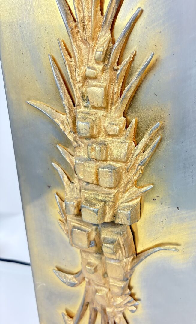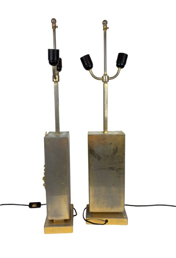 Paire de lampes à base quadrangulaire en laiton ornée d’une pépite à motif floral en bronze doré, surmontée d’un fût rectangulaire terminé par deux bras de lumières à patine doré