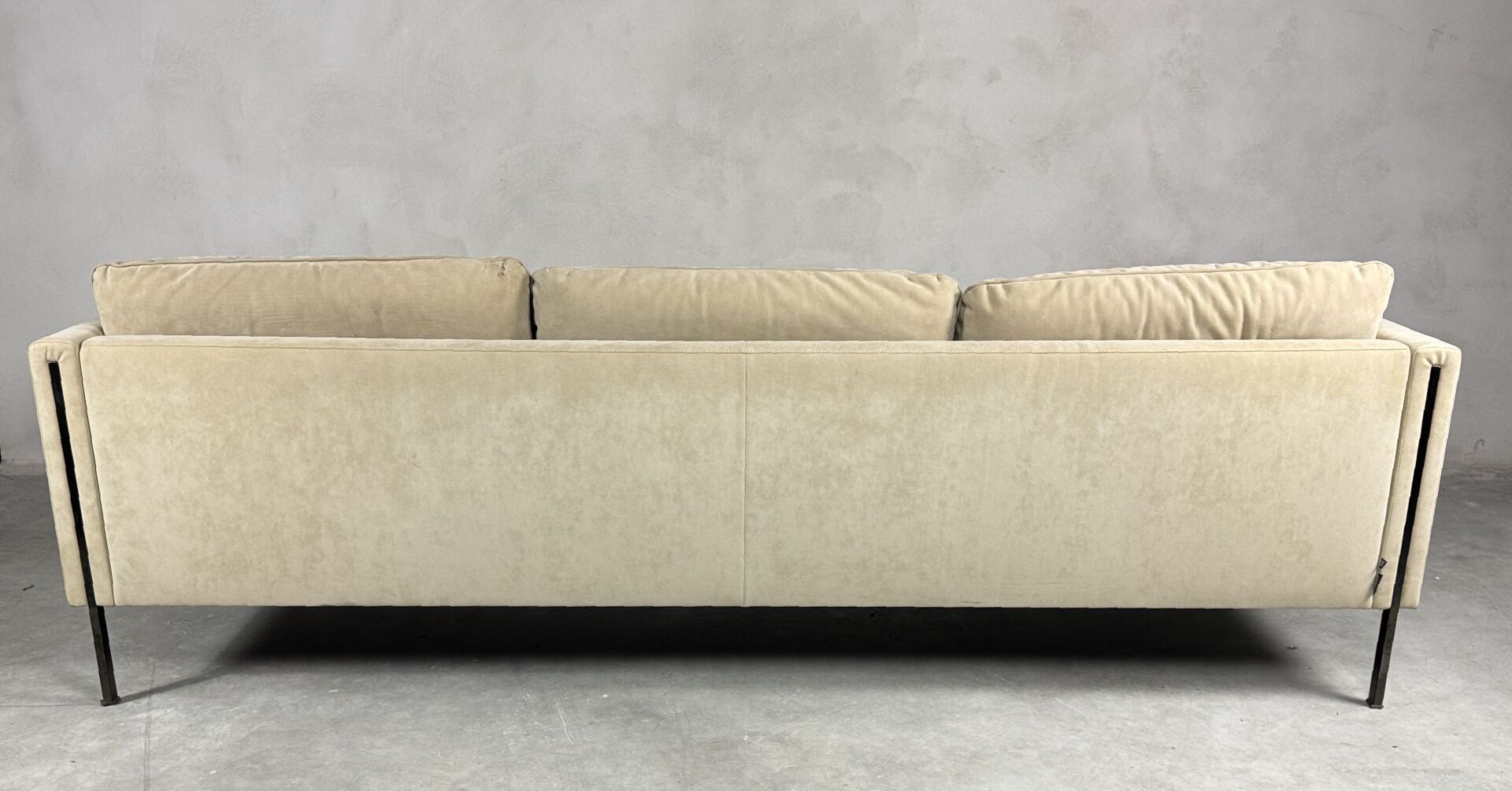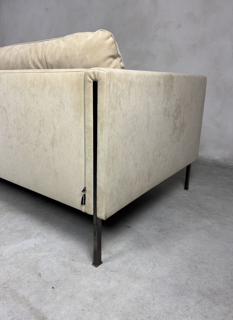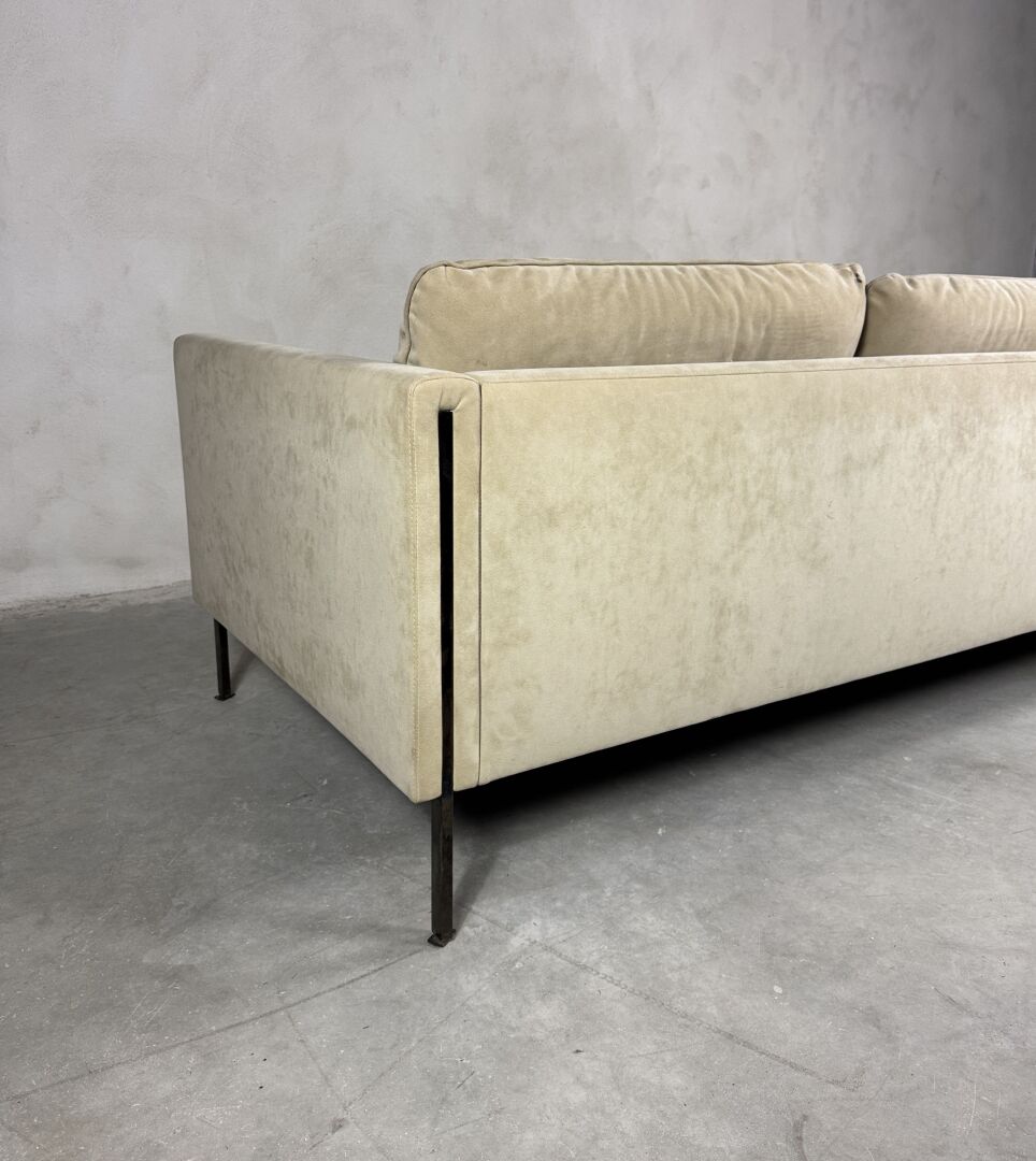 Canapé modèle Andy, trois places, à structure en métal chromé noir, couverture d’alcantara beige, coussins capitonnés