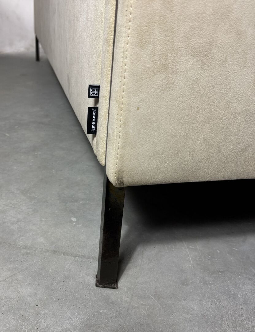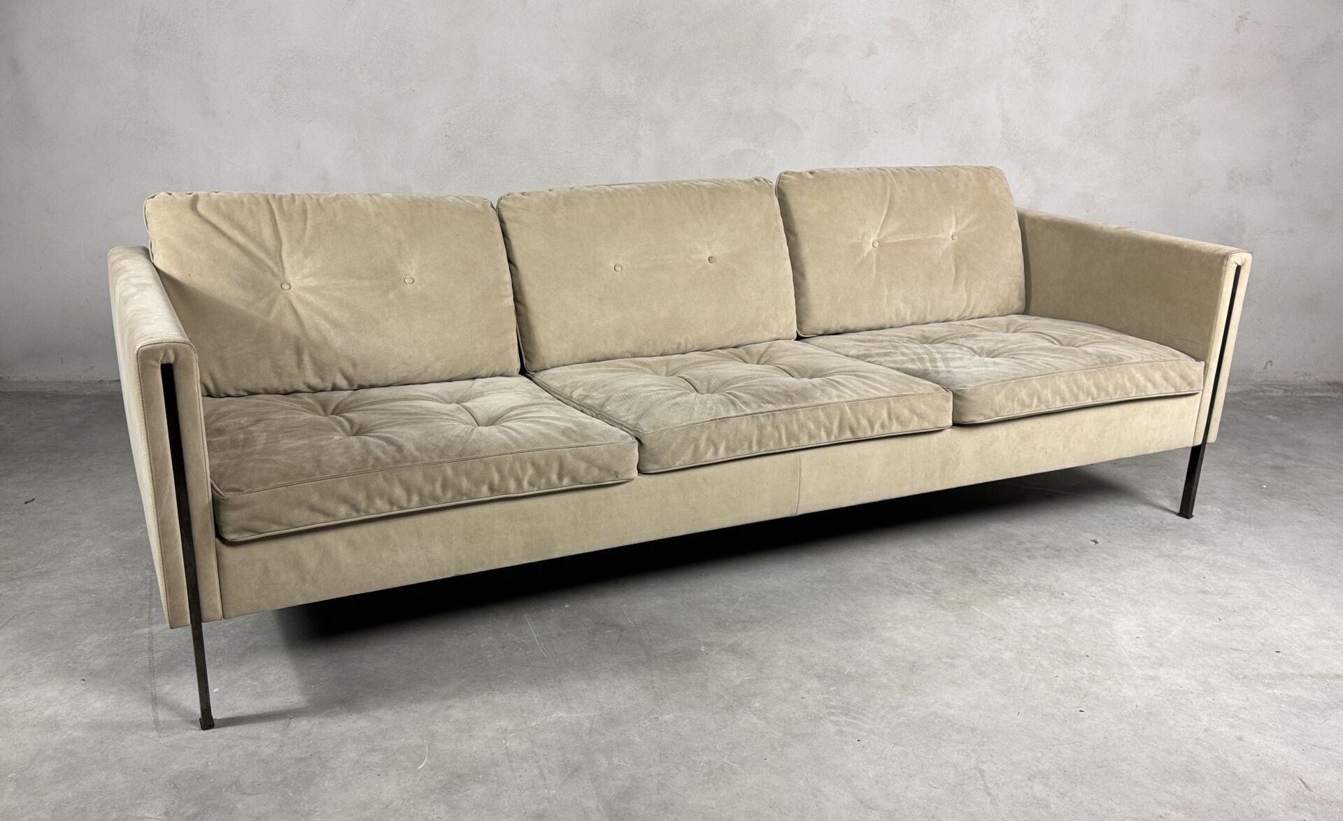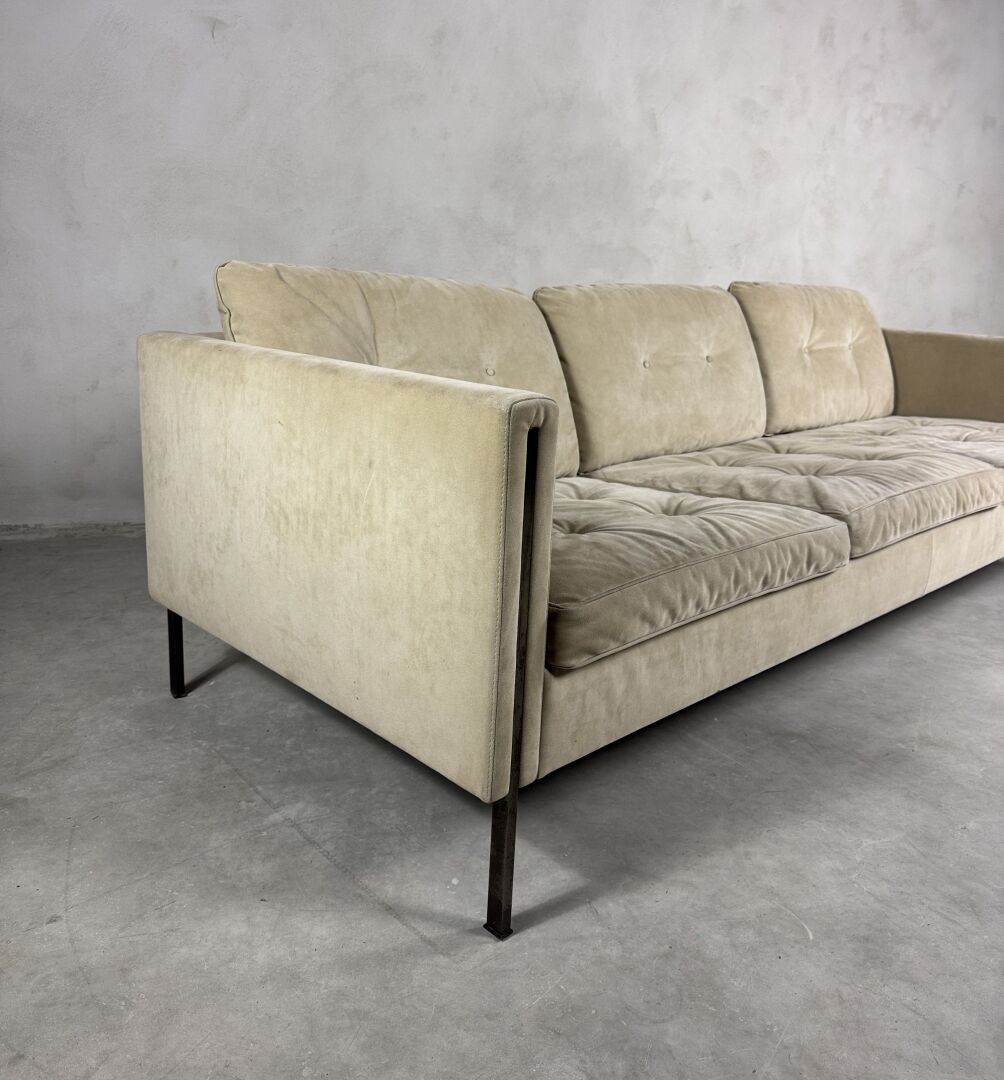 Canapé modèle Andy, trois places, à structure en métal chromé noir, couverture d’alcantara beige, coussins capitonnés