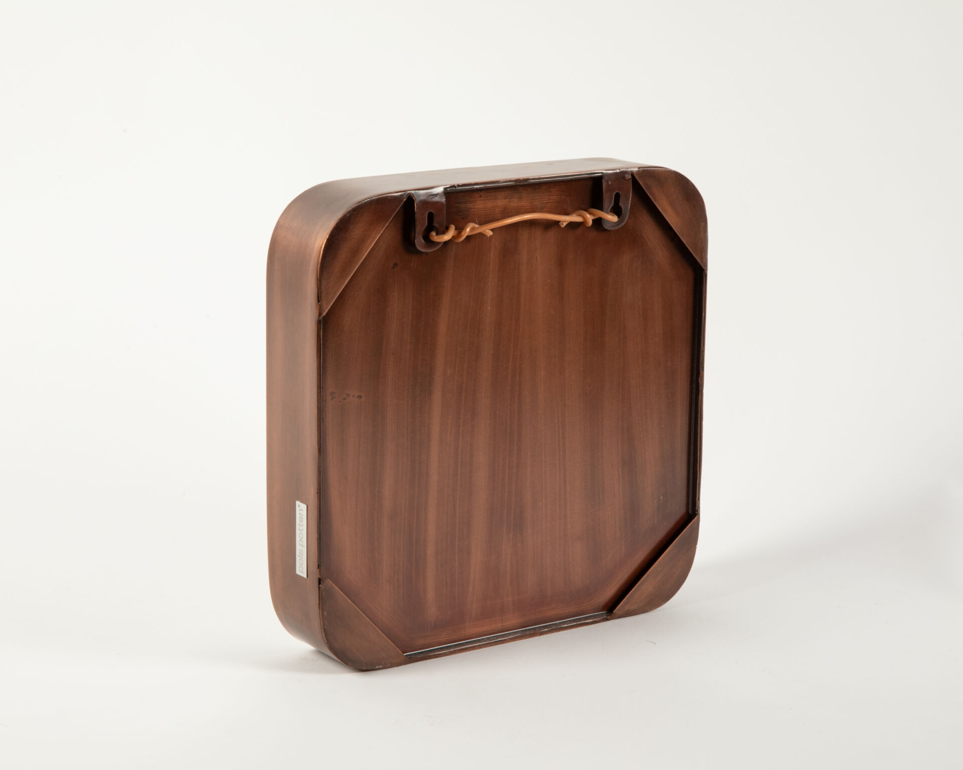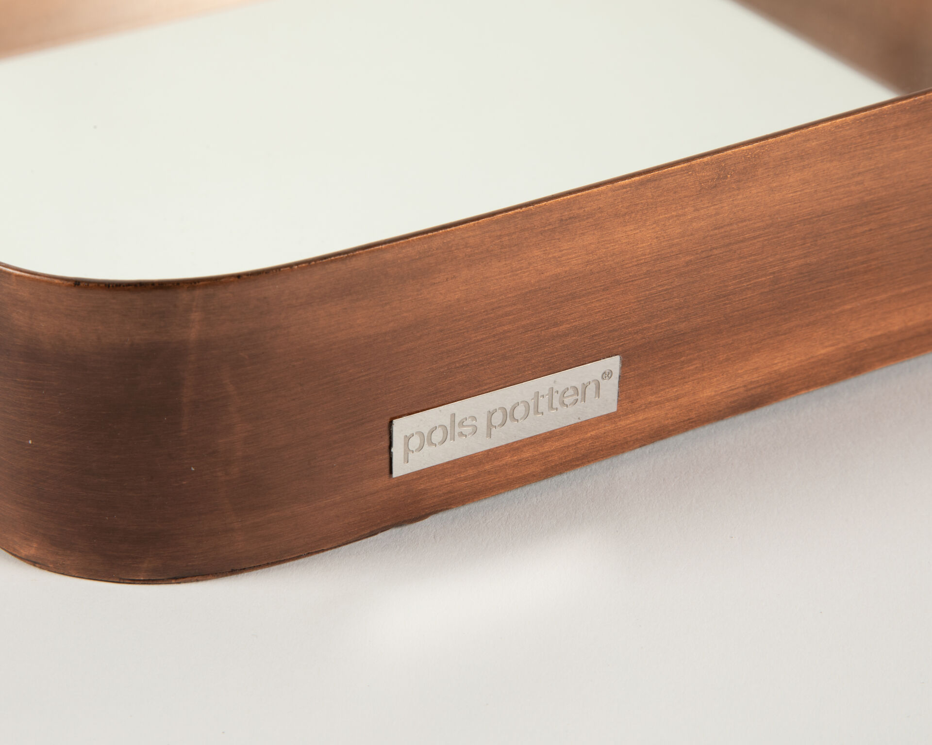 32 ESTIMATION: 80 / 120 € POLS POTTEN Suite de cinq miroirs carré à bords amoindris à encadrement en acier à patine cuivrée Coté : 26 cm