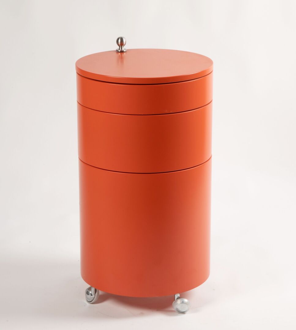 35 ESTIMATION: 150 / 400 € Verner PANTON (1926-1998), Réedition VERPAN Modèle Barboy – Desserte mobile cylindrique à trois compartiments en bois laqué orange H : 74 – D : 38 cm