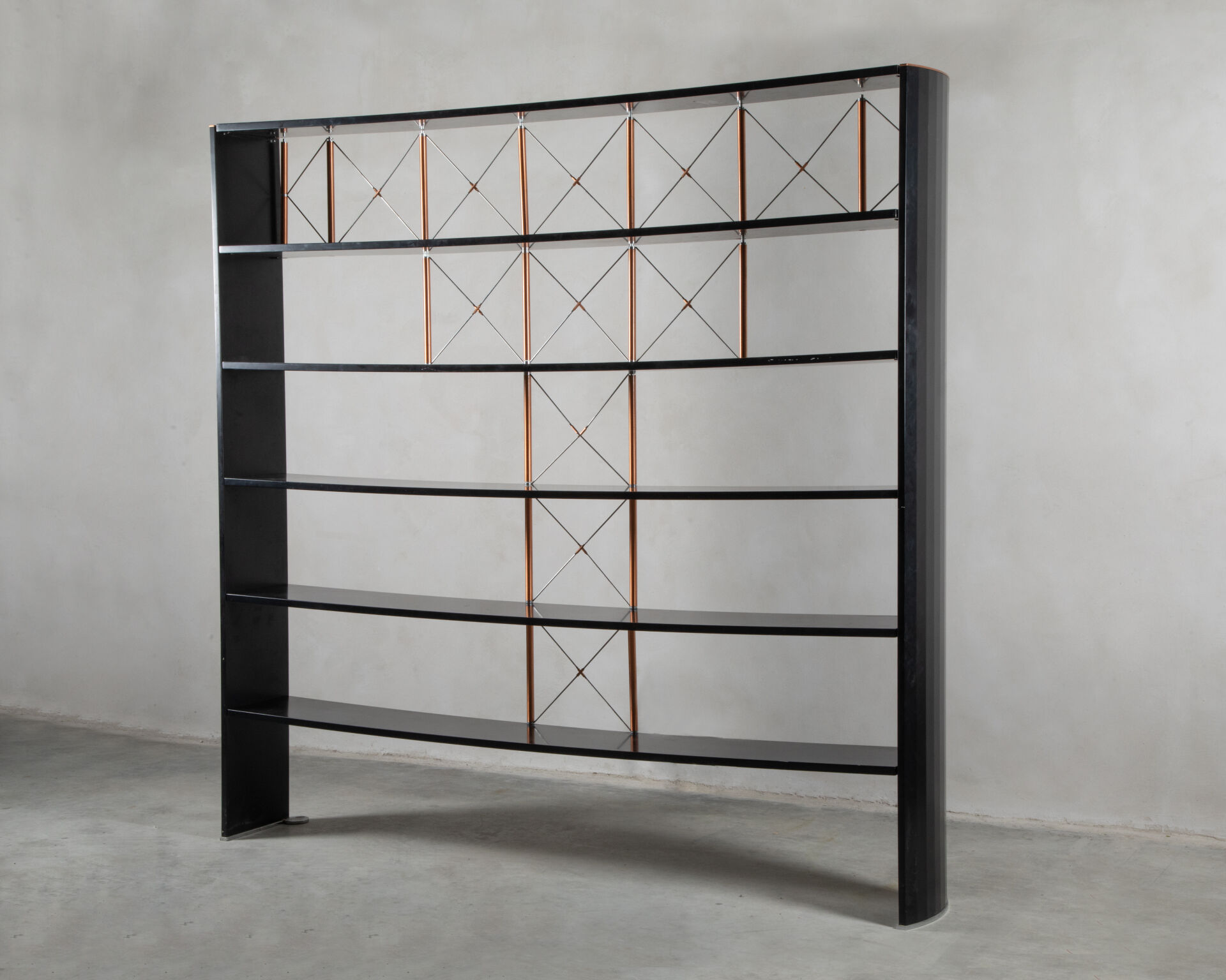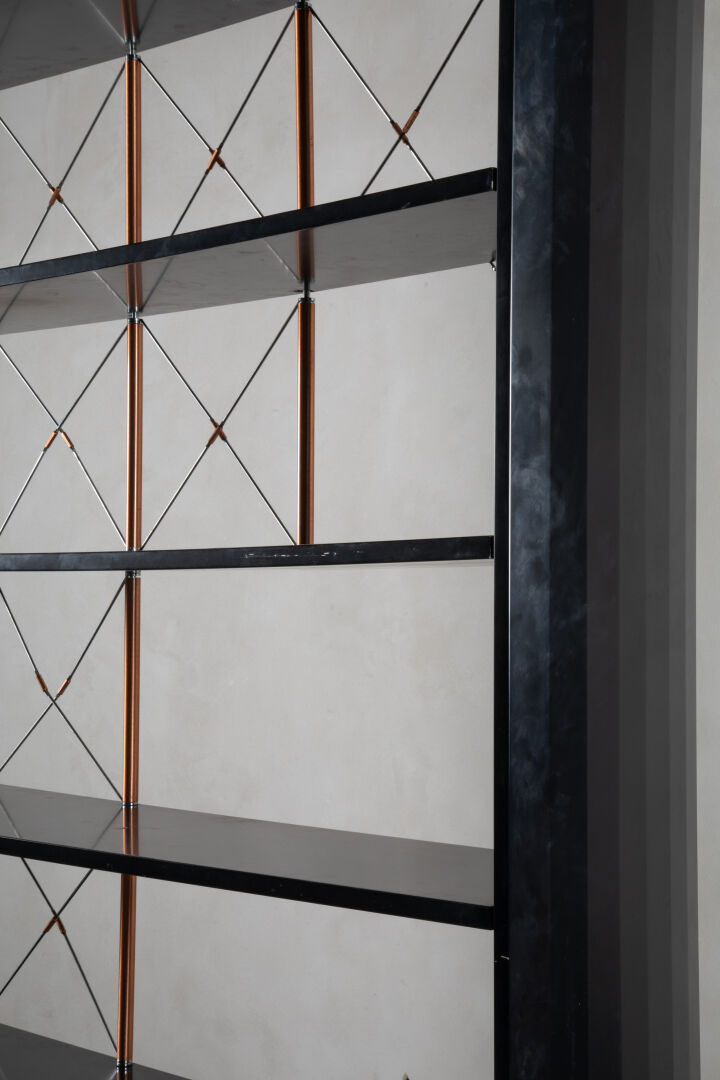 Modèle Marly – Grande bibliothèque en mélaminé noir, montants facettés à l’extérieur, à rayons en cuivre reliés par des tirants métalliques réglables.