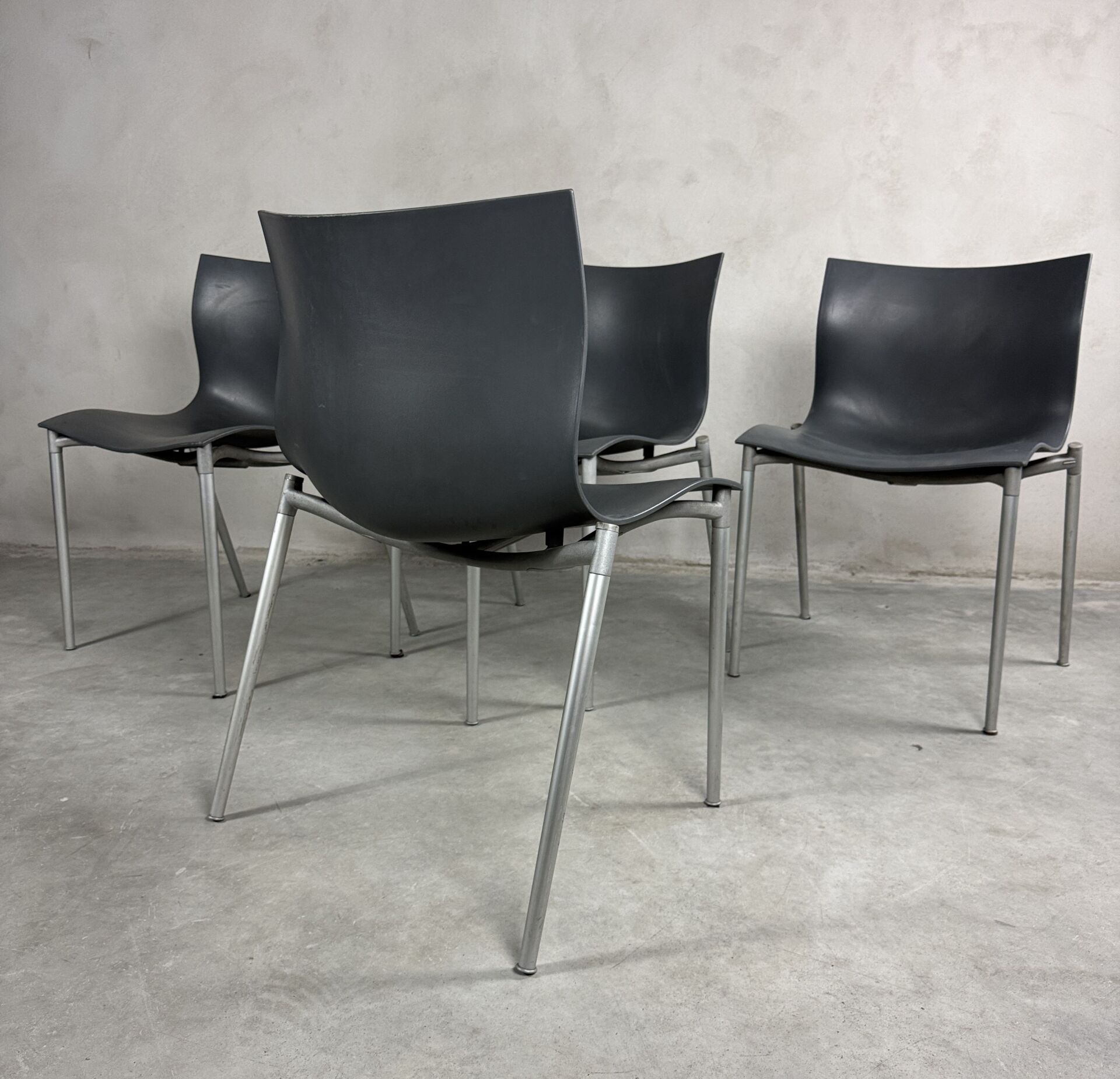 43 ESTIMATION: 80 / 120 € Philippe STARCK (né en 1949) – DRIADE et ALEPH Éditeur Modèle Cam El Eon – Suite de quatre chaises, coque en plastique thermoformé gris reposant sur un piètement quadripode tubulaire Tâches et frottements H : 76 cm