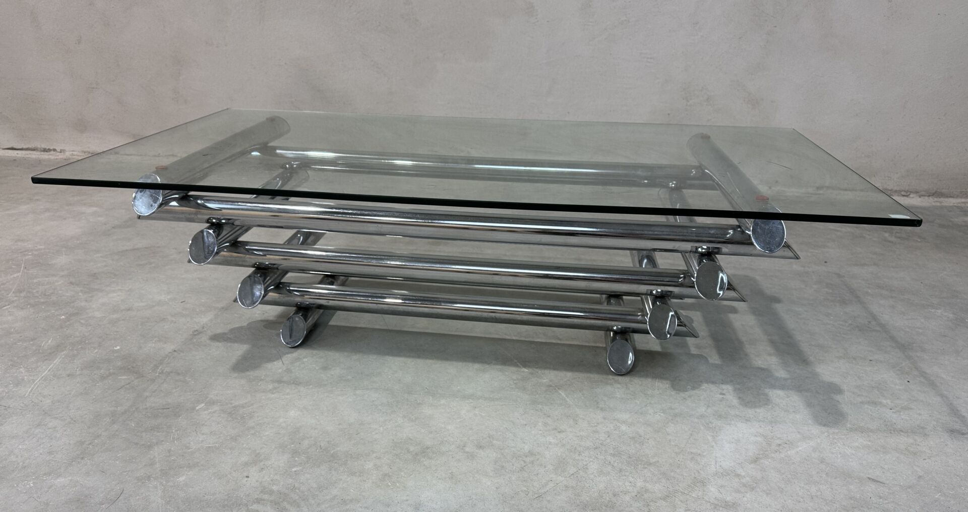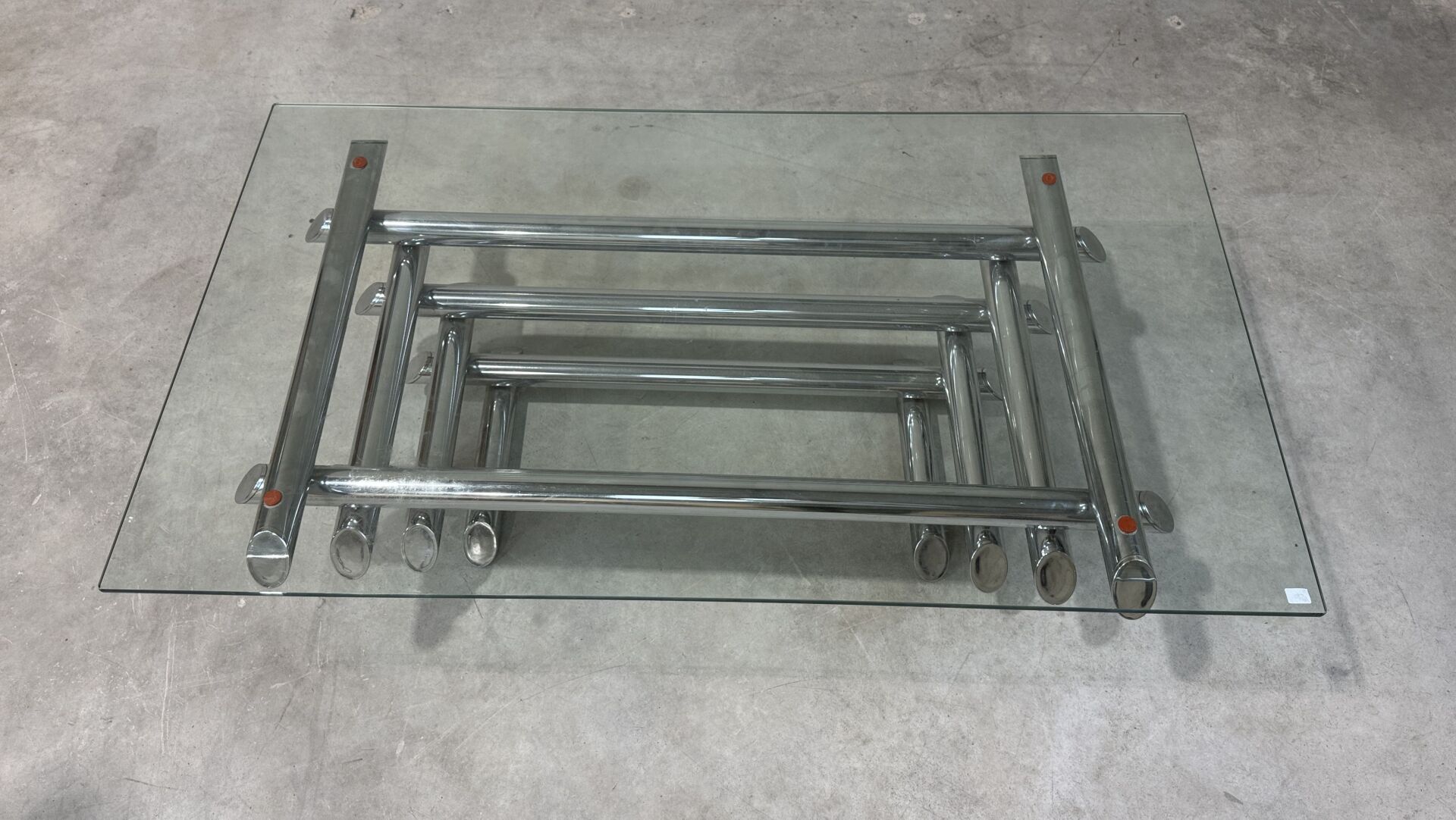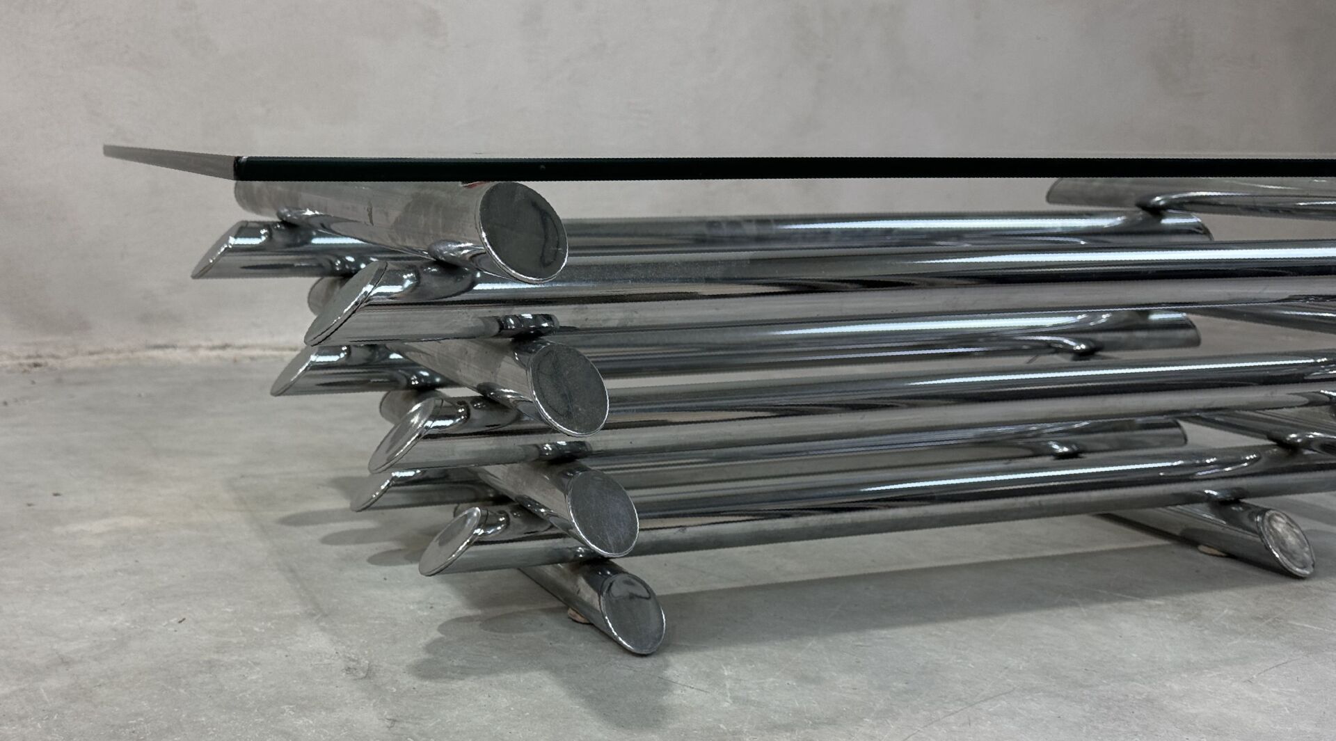57 ESTIMATION: 200 / 300 € Willy RIZZO (1928 – 2013), dans le gout de Table basse à plateau de verre, structure en métal chromé formée de tubes, à la façon de tubes d’orgue. Vers 1970 H : 32.5 – L : 120 – P : 69 cm