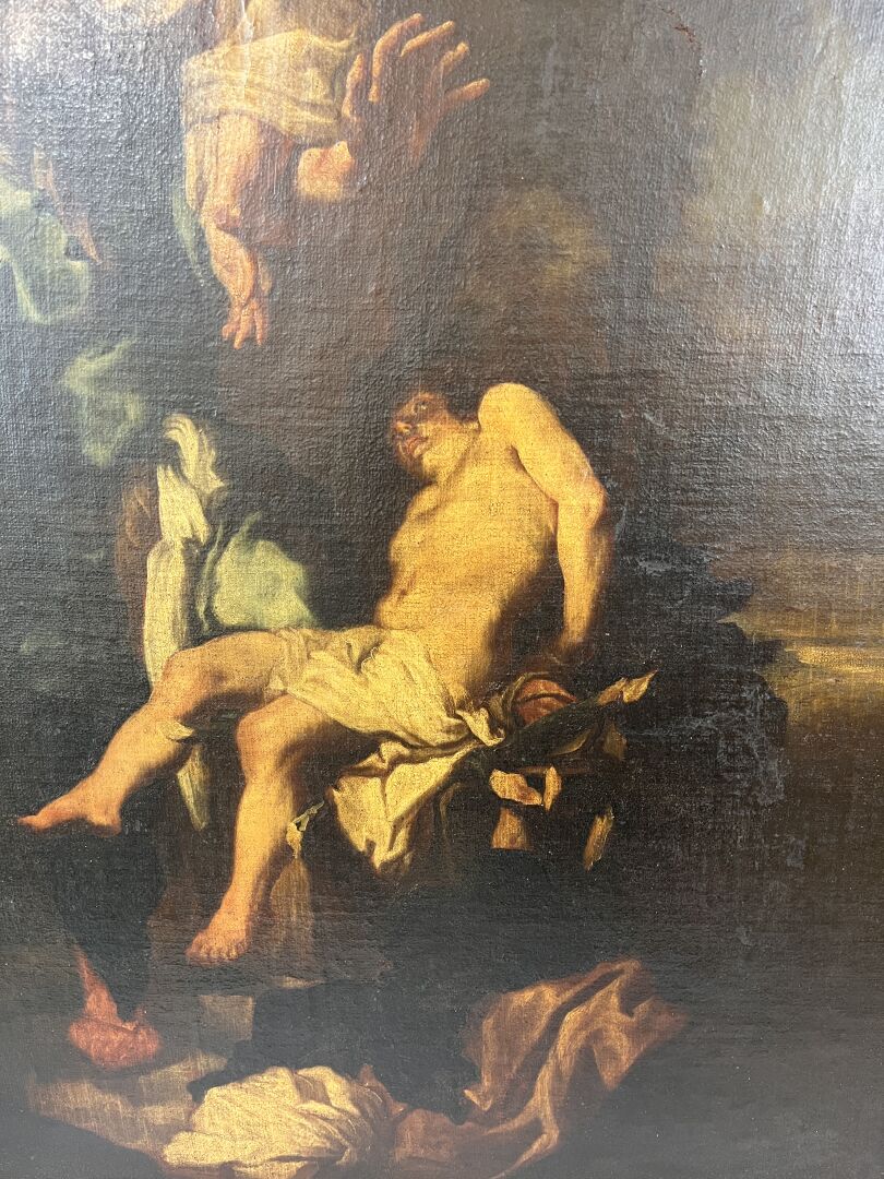 201 RÉSULTAT: 1600 € ESTIMATION: 700 / 1000 € Ecole XIX° d’après Dominico FETTI L’ange du Seigneur empêchant Abraham de sacrifier son fils Isaac Huile sur toile, Rentoilée, petits sauts de matière et accidents 86 x 72 cm