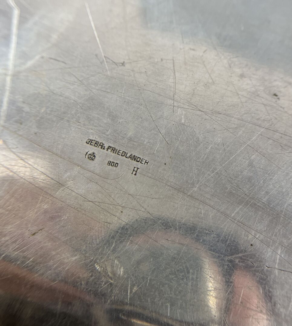 Important plateau en argent de forme ovale polylobé, la bordure à décor ciselé de guirlandes nouées de feuilles de lauriers. Travail Allemand en argent (800 millièmes), poinçon d’orfèvre GEBRÜDER FRIEDLÄNDER.