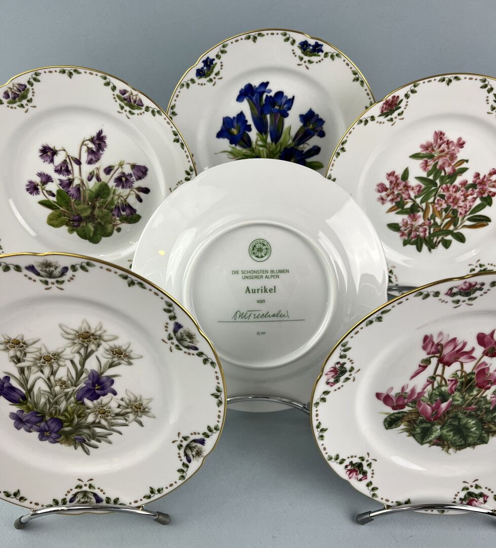231 RÉSULTAT: 30 € ESTIMATION: 30 / 50 € VEREIN ZUM SCHUTZ DER BERGWELT Suite de six assiettes en porcelaine à décor de fleurs des champs, l’aile légèrement chantournée D : 20.3 cm