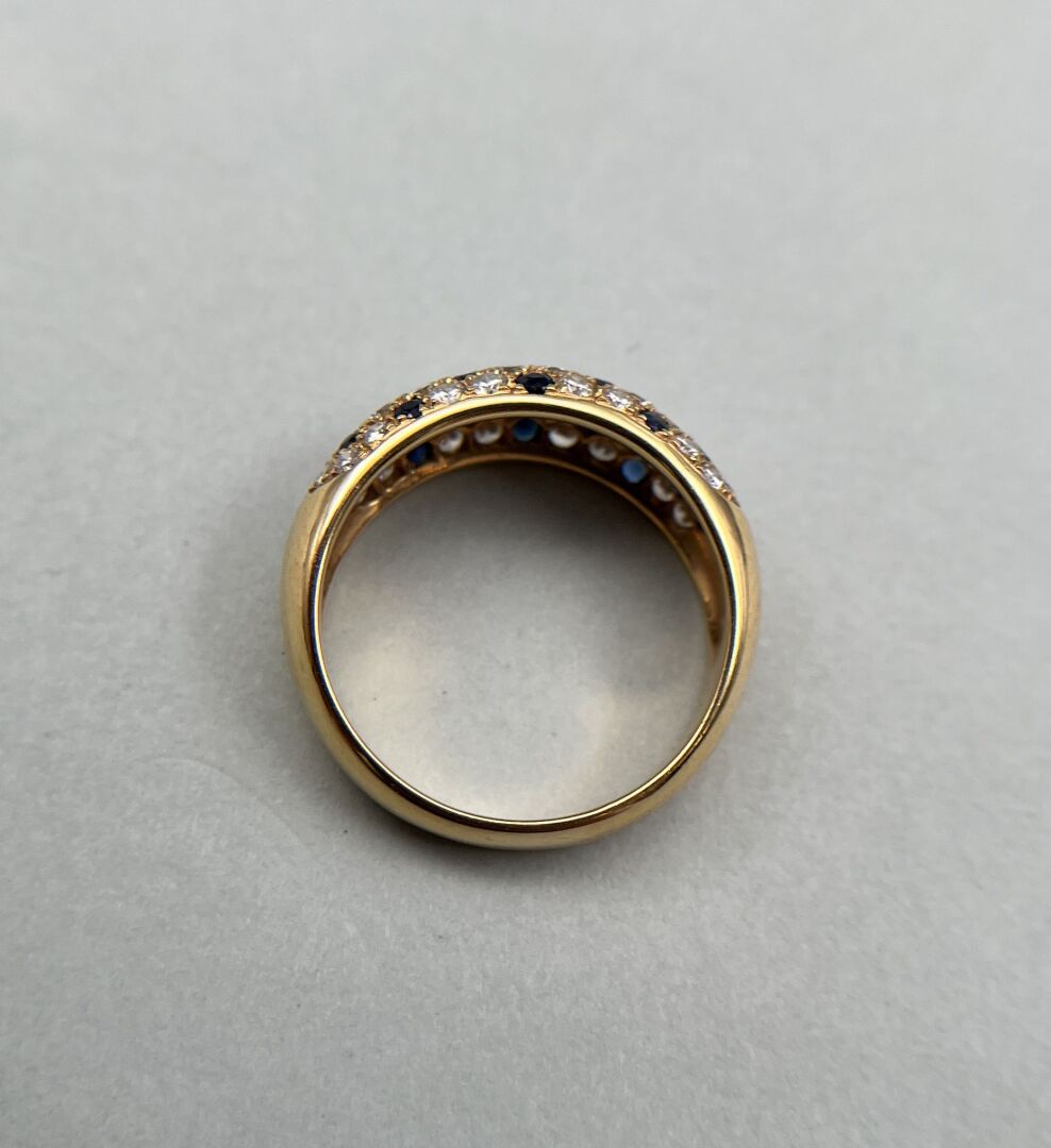 31 RÉSULTAT: 310 € ESTIMATION: 200 / 300 € Bague dôme en or jaune (750 millièmes) pavage de saphirs et brillants calibrés Travail des années 1980 TDD : 54 Poids brut : 5.3 g.
