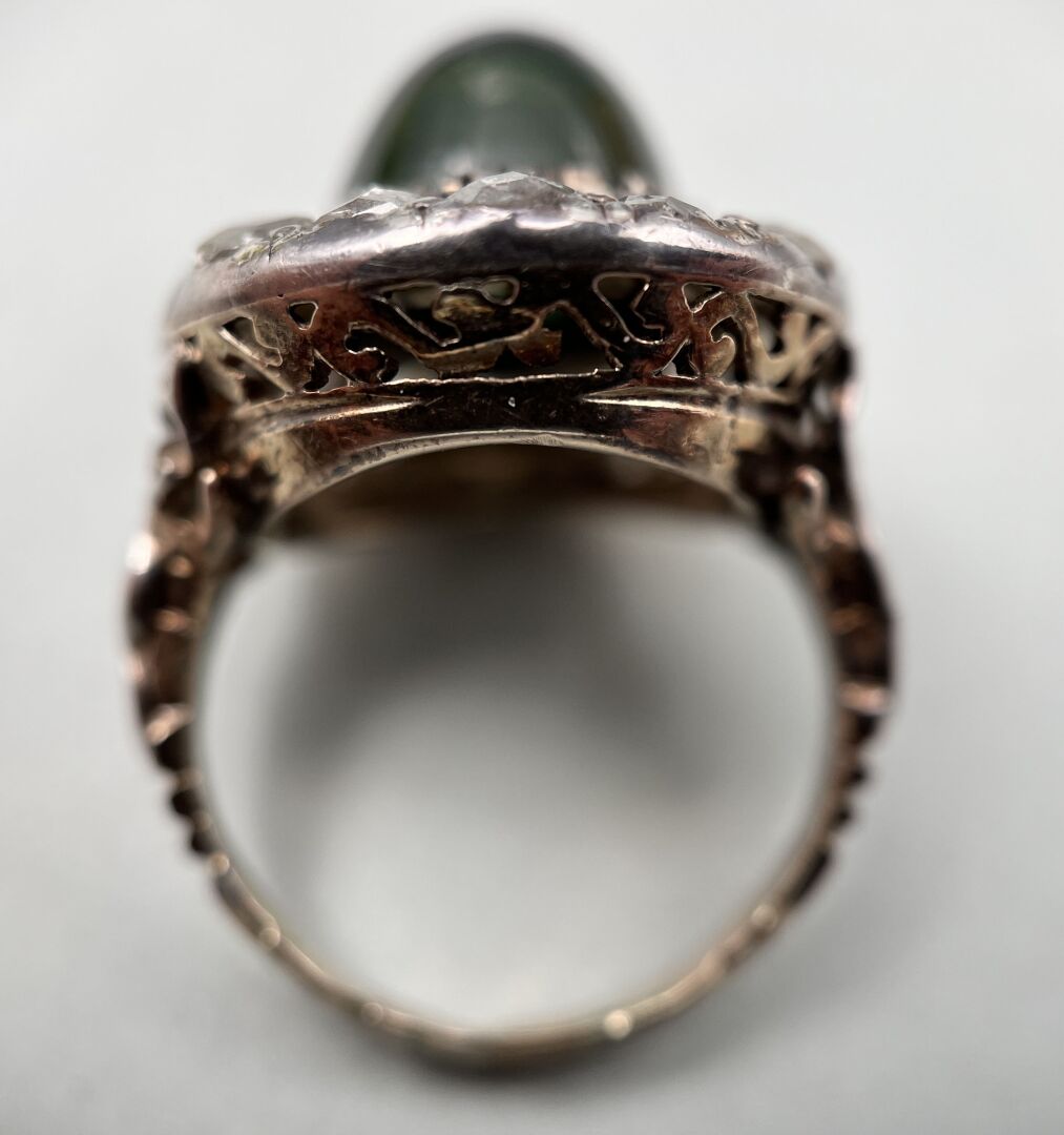 5 RÉSULTAT: 500 € ESTIMATION: 500 / 800 € Bague en or jaune (750 millièmes), double cabochon de saphir (probablement) dans un entourage de diamants taille ancienne Travail XVIII° début XIX° TDD : 52 Poids brut : 7,7 g.