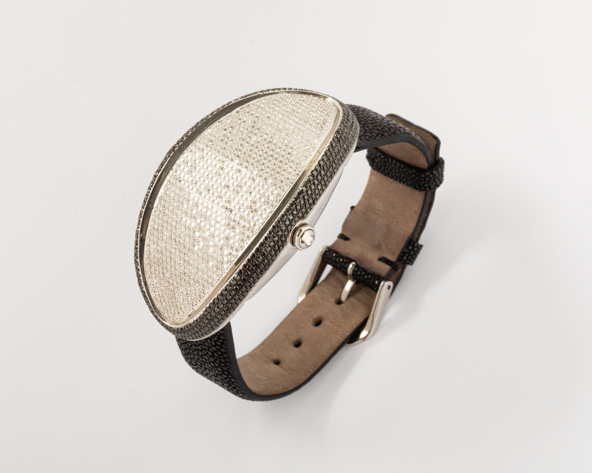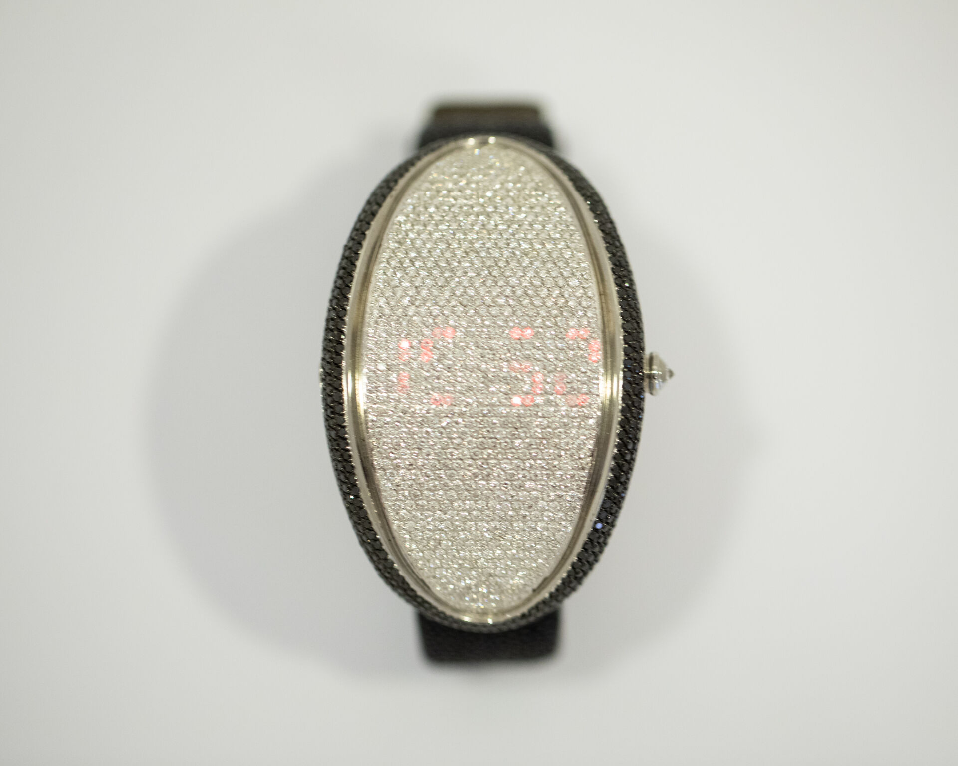 Long boîtier ovale en acier entièrement pavé de diamants et diamants noirs sur le dessus. Affichage des heures en chiffres arabes en rouge LED. Mouvement quartz. Bracelet en galuchat noir. Boucle ardillon acier.