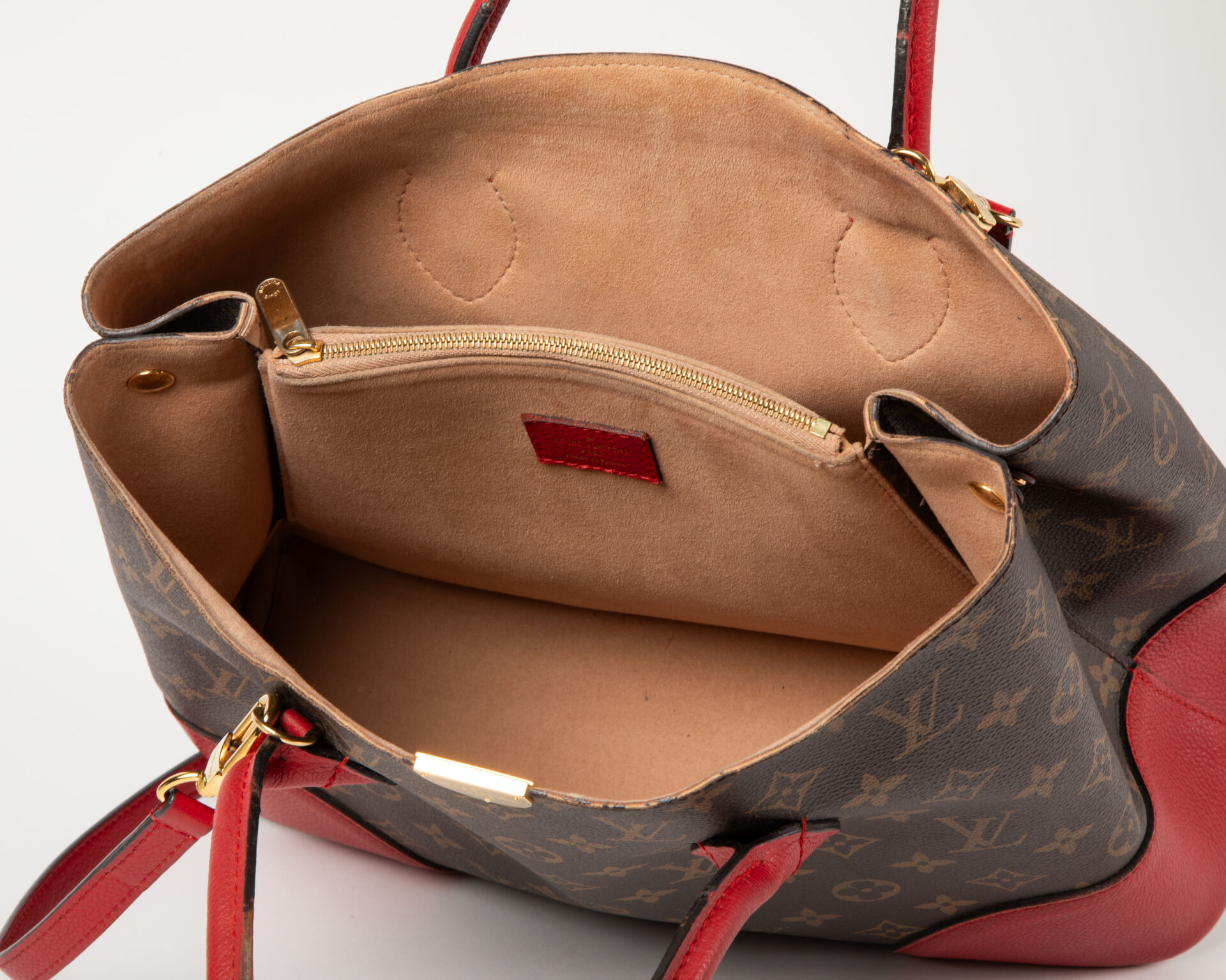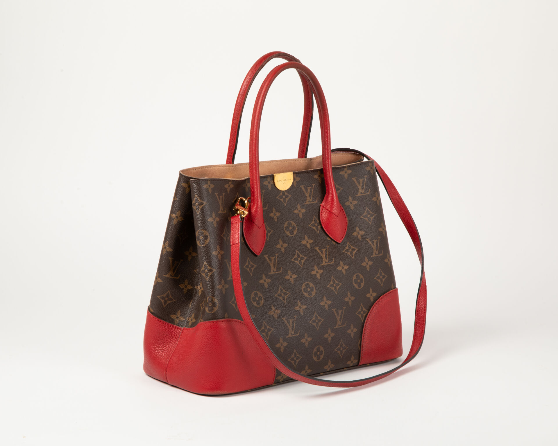 Modèle Flandrin – Sac en toile monogram à deux anses et bandoulière amovible, coins en cuir épi rouge, intérieur en suédine naturelle ouvrant sur une poche à fermeture à glissière formant séparation, soufflet pression, accastillage en métal doré