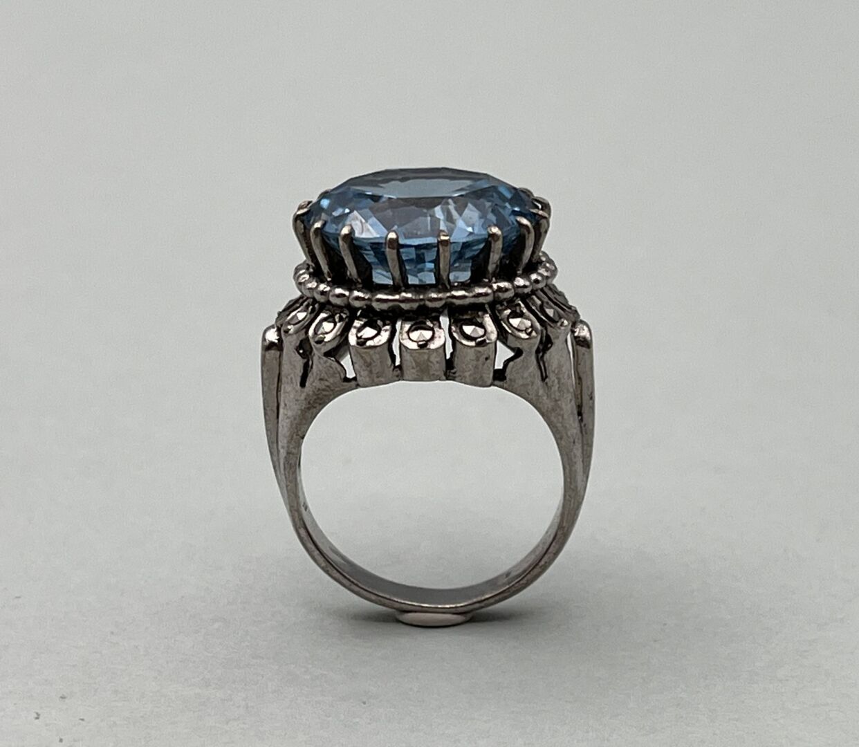 128 RÉSULTAT: 380 € ESTIMATION: 80 / 120 € Bague en argent (925 millièmes) sertie d’une importante aigüe-marine ronde facetté TDD : 53 Poids : 7.5 g
