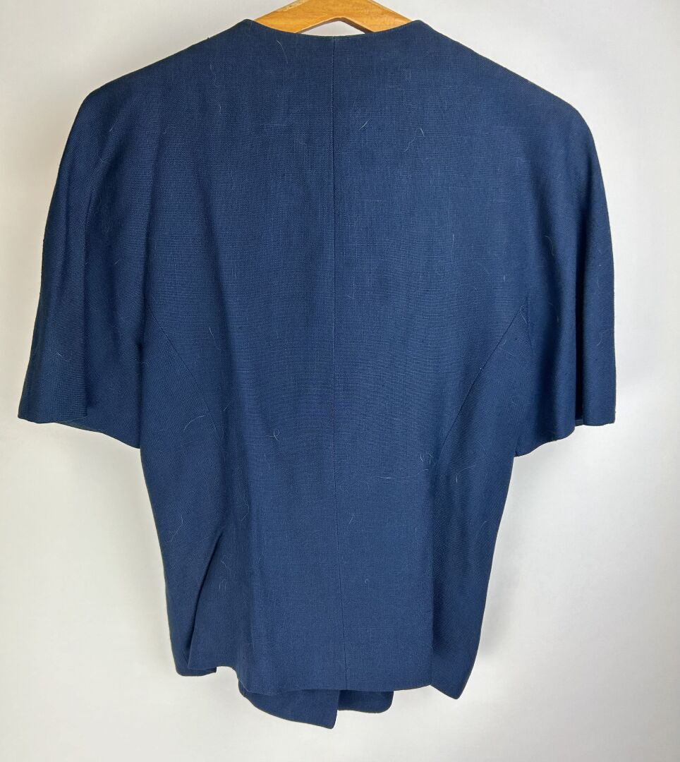 On y joint par GUY LAROCHE, veste en viscose bleu nuit ouvrant à trois boutons à l’imitation de la nacre