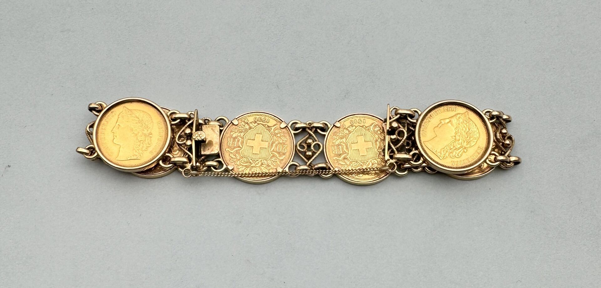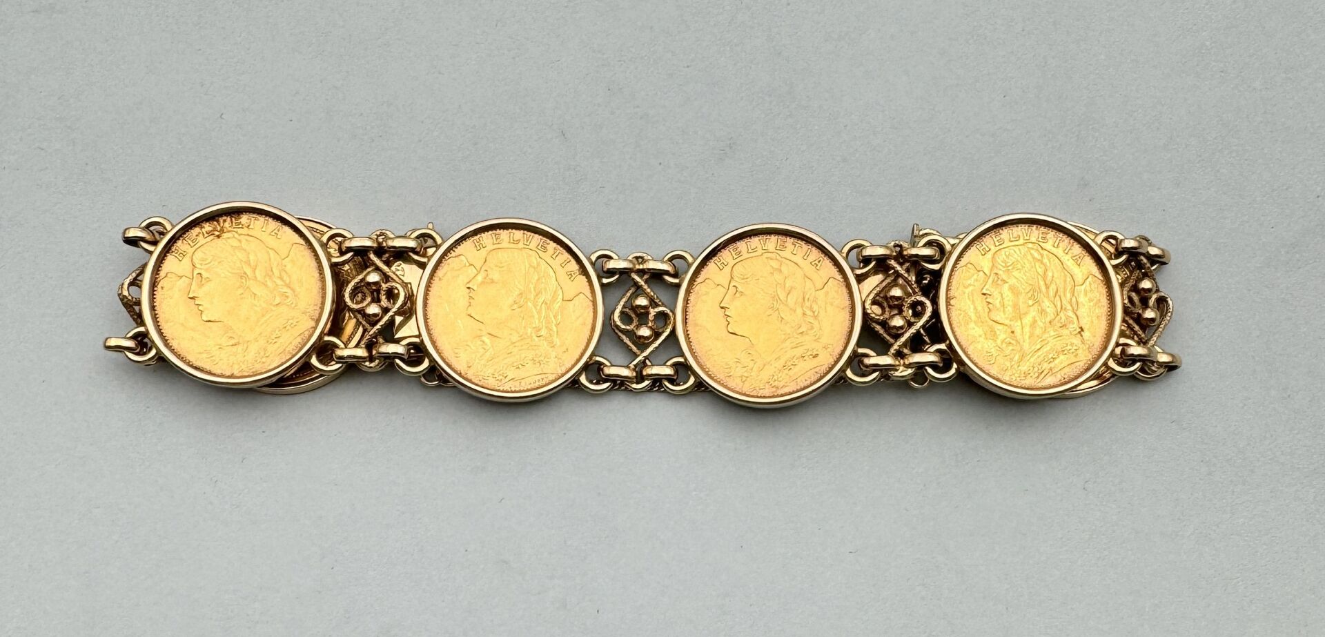 3 RÉSULTAT: 3060 € ESTIMATION: 2000 / 2200 € Bracelet en or jaune (750 millièmes) à larges mailles ajourées sertissant clos six pièces de 20F or Suisse (1883,1897,1918, 1930, 1902, 1886) Poids : 62.7 g.