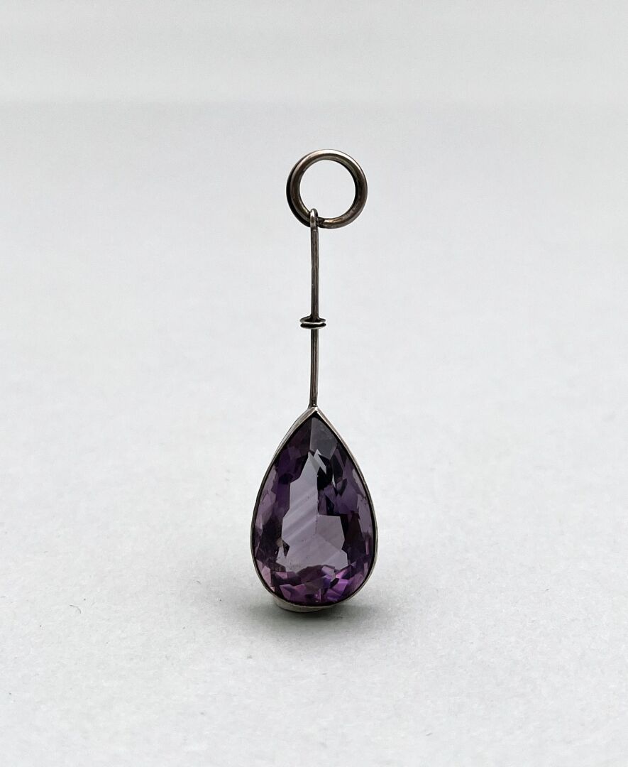 136 RÉSULTAT: 40 € ESTIMATION: 40 / 60 € Pendentif en argent (925 millièmes) orné d’une importante améthyste taillée en poire Poids brut : 4.2 g Améthyste de 20 x 13 x 9.3 mm