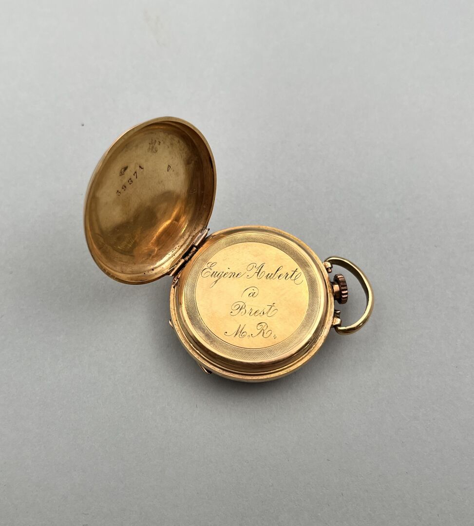 146 RÉSULTAT: 480 € ESTIMATION: 220 / 250 € Montre de col en or jaune 750 millièmes, double boitier, poinçon tête de cheval, à décor de fleurs émaillées Poids brut : 22.2 g