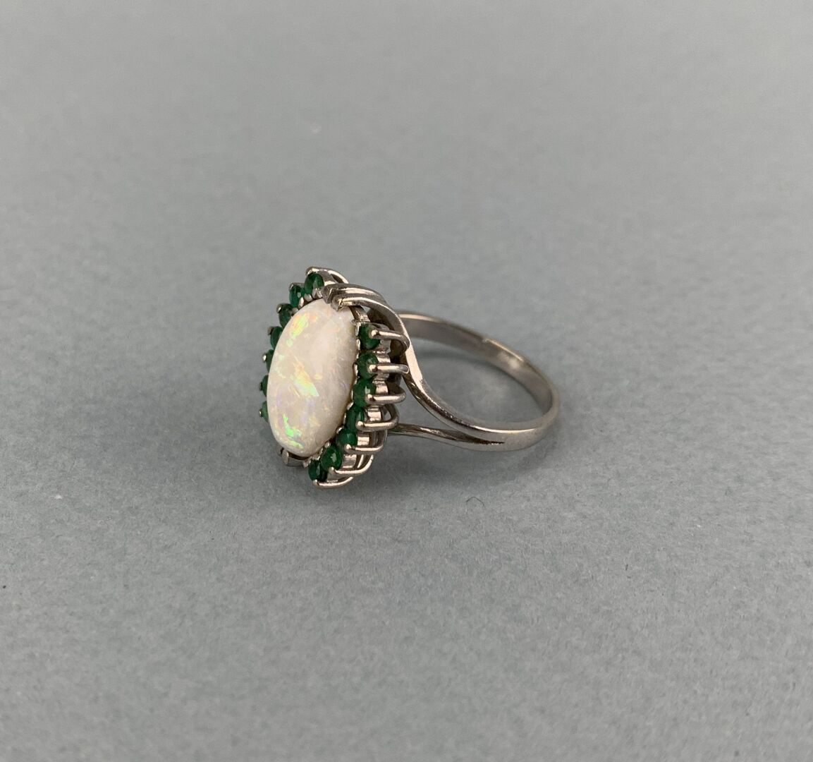54 RÉSULTAT: 320 € ESTIMATION: 150 / 200 € Bague en or gris 18K (750 millièmes) ornée d’une opale arlequin bordée de petites émeraudes rondes facettées. Tour de doigt: 54. P. Brut: 5,4 g. ( Egrisures).
