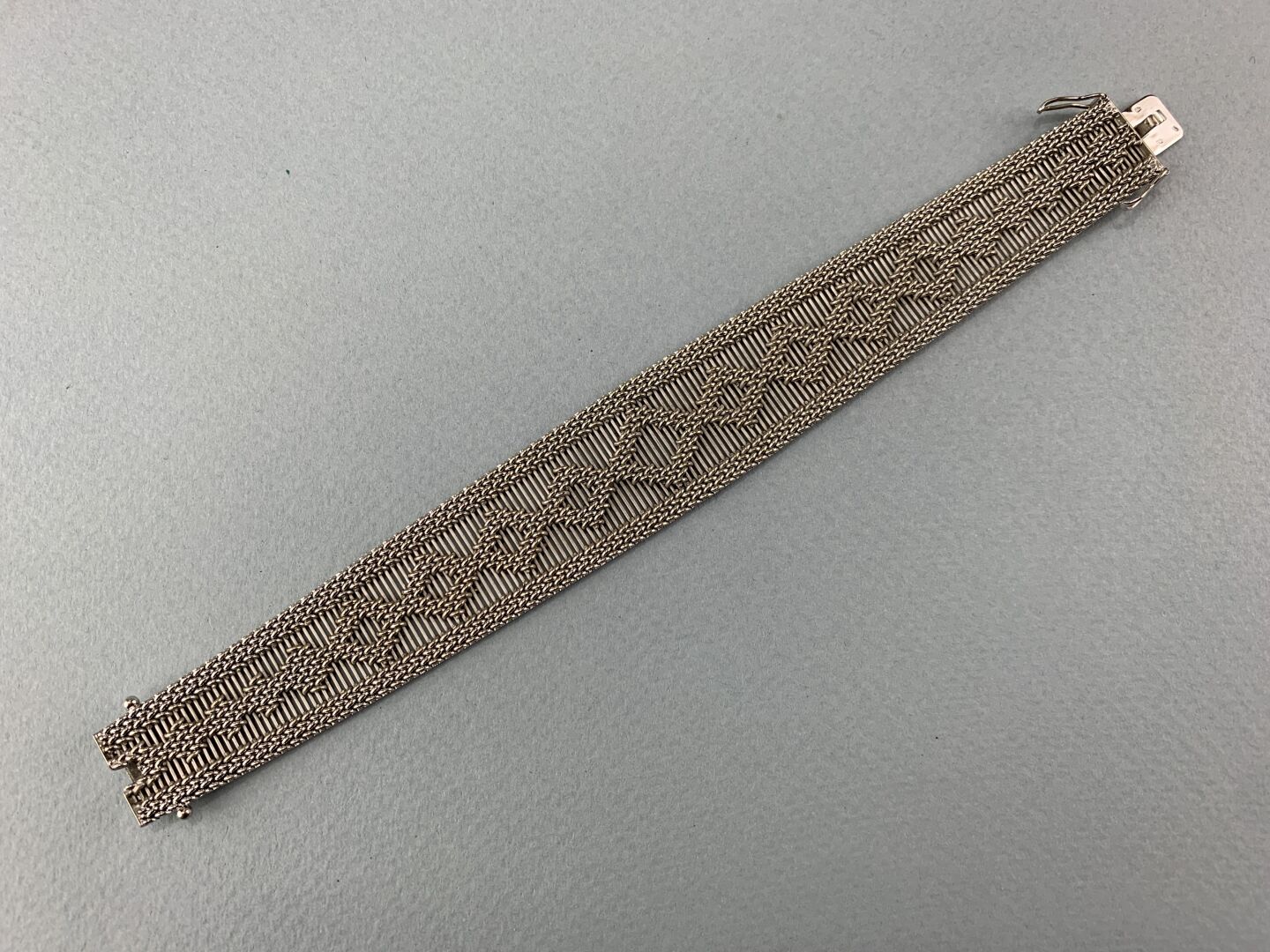 Bracelet ruban en or gris 18K (750 millièmes) et argent (800 millièmes) ajouré et tressé à motifs géométriques. Fermoir cliquet, double huit de sécurité.
