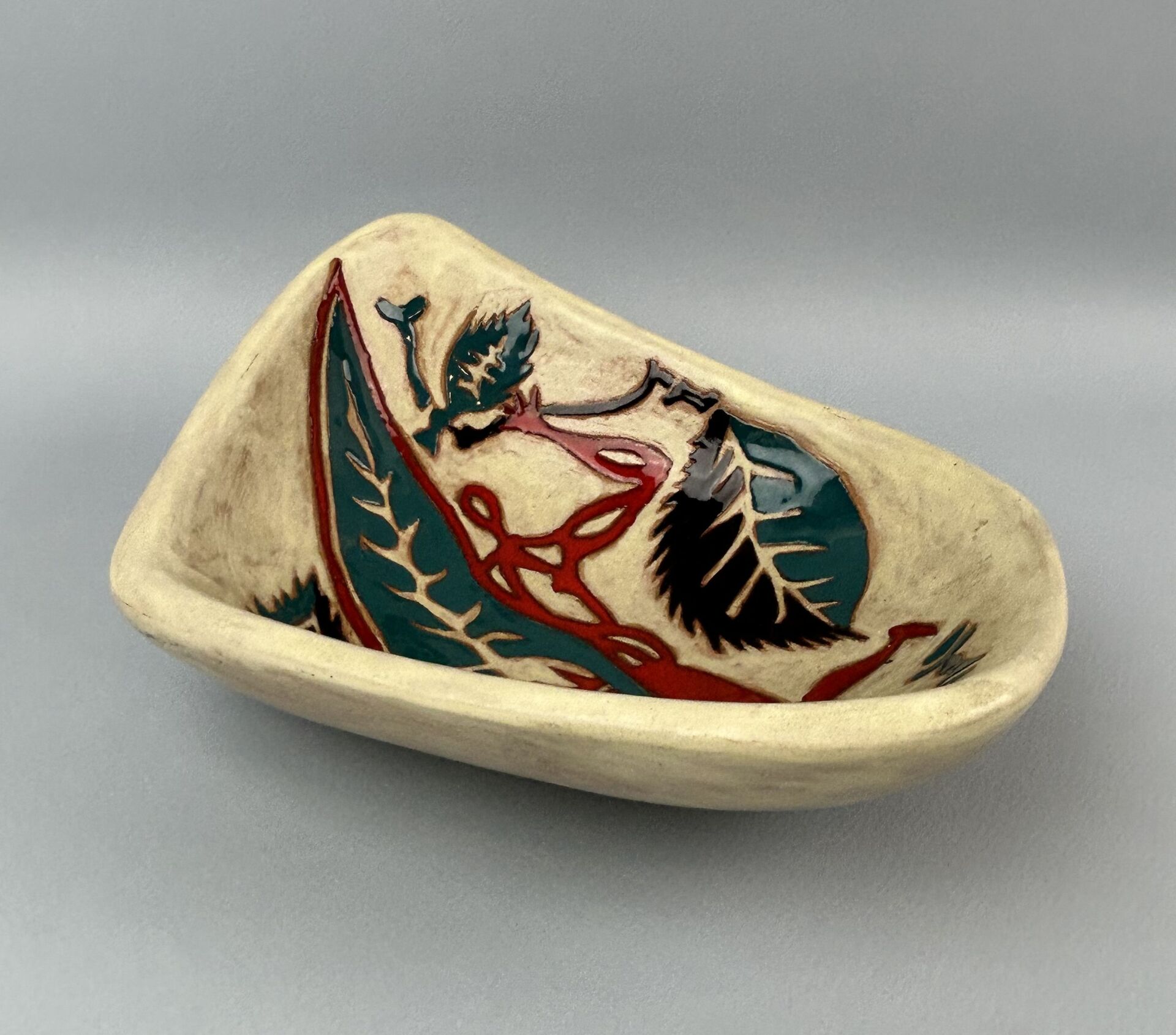 Coupe de forme libre en céramique partiellement émaillée à décor polychrome