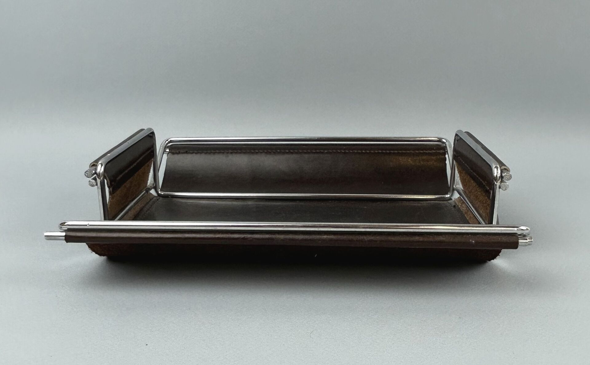 149 RÉSULTAT: 120 € ESTIMATION: 40 / 60 € Gérard RIGNAULT (XX°), attribué à Vide poche en cuir chocolat et métal chromé Petites traces H : 6 – L : 26 – P : 23.4 cm