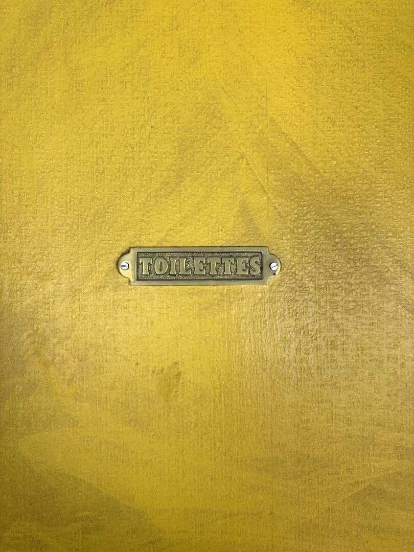 232 ESTIMATION: 80 / 120 € Porte dissimulée en bois à lambris bas mouluré et peint blanc, plaque toilettes en laiton, charnières à vis Travail XIX° H : 222 – L : 82 cm environ