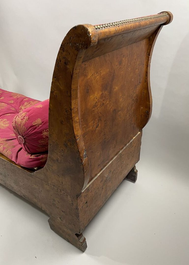 58 RÉSULTAT: 80 € ESTIMATION: 200 / 300 € Méridienne en placage de ronce de noyer et ronce de noyer, couverture de soie rose à décor doré d’abeilles Travail d’Epoque Empire Accidents et sauts de placage H : 90 – L : 172 – P : 57 cm