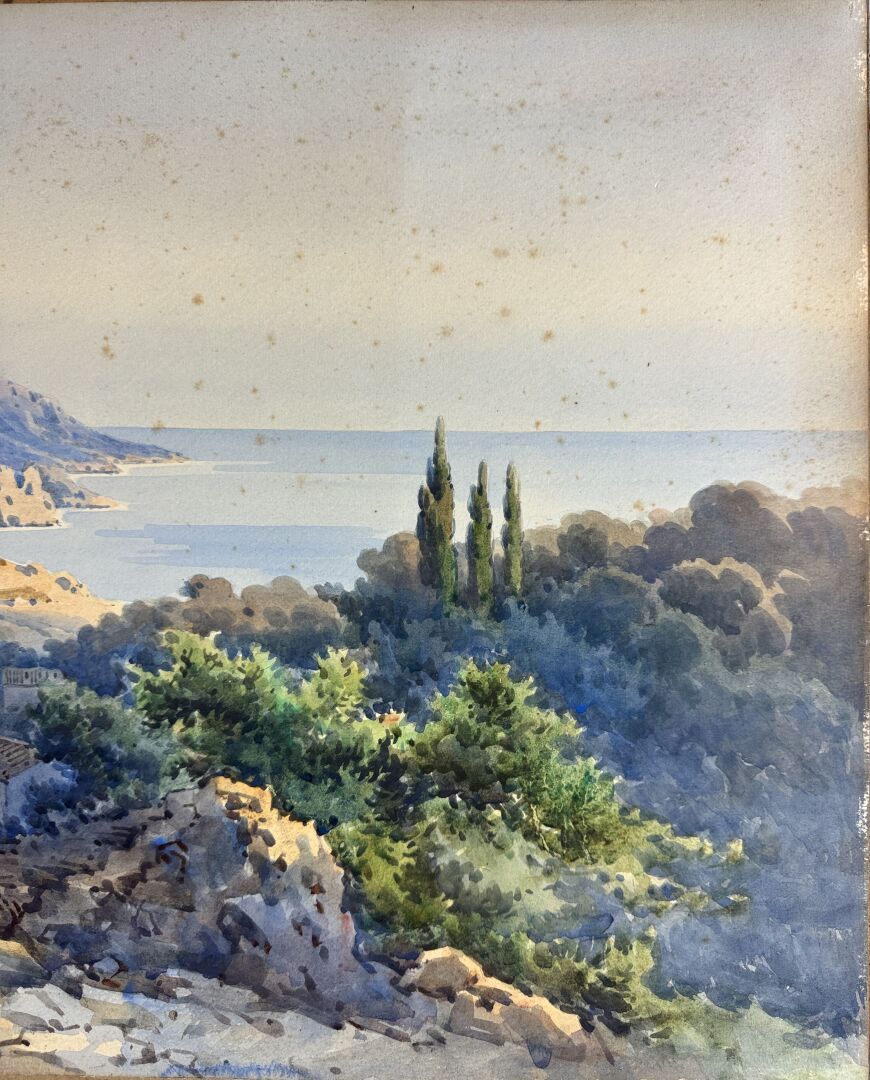 84 RÉSULTAT: 1250 € ESTIMATION: 800 / 1200 € Angelos GIALLINA (1857-1939) Collines de Corfou animées, Aquarelle sur papier signée en bas à gauche, Piqures 40 x 60 cm environ