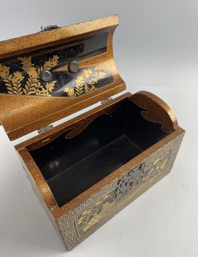 89 RÉSULTAT: 8300 € ESTIMATION: 1000 / 1500 € Coffret de type Namban en bois laqué à décor doré de scènes animées et incrustation de nacre Travail période EDO, fin XVIII° début XIX° siècle H : 15.7 – L : 22 – P : 13 cm