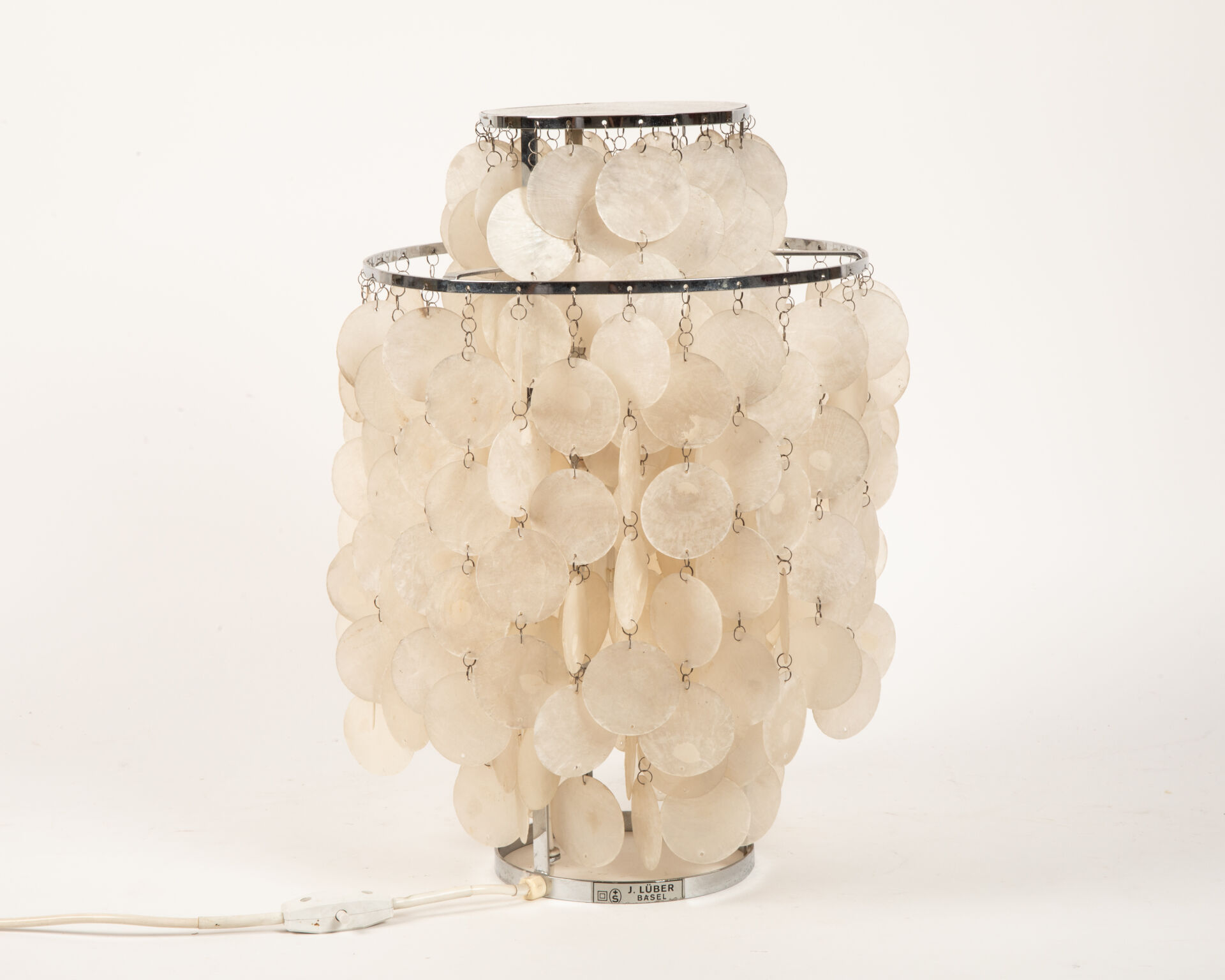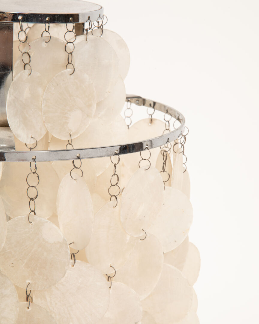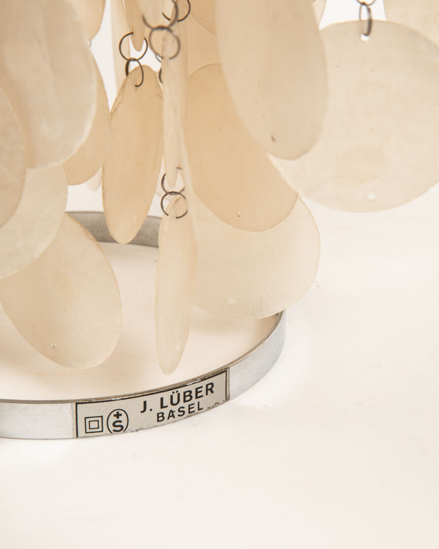 Modèle Fun, lampe à poser structure formée de deux anneaux de métal chromé superposés et suspensions de pastilles de nacre