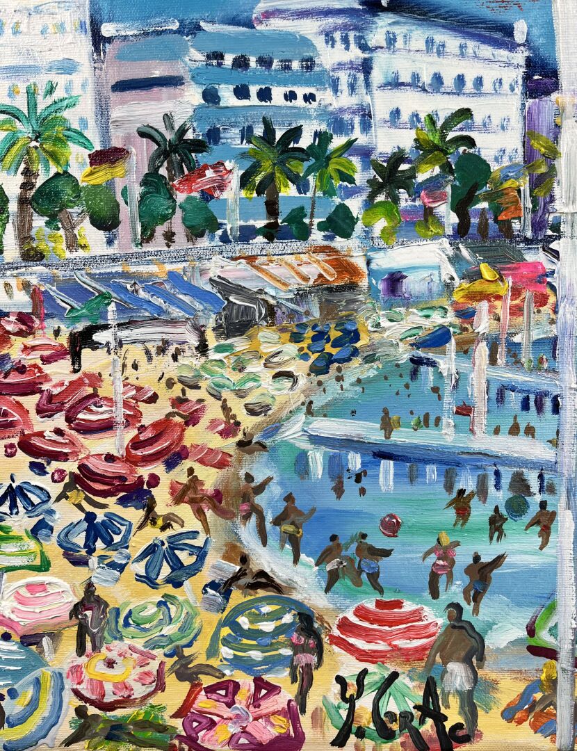 191 ESTIMATION: 1200 / 1500 € Yvon GRAC (1945), Ecole de Nice Sur le Sable d’Or de Cannes Huile sur toile signée en bas à droite, titrée et contresignée au dos, plaquette jointe 50 x 61 cm