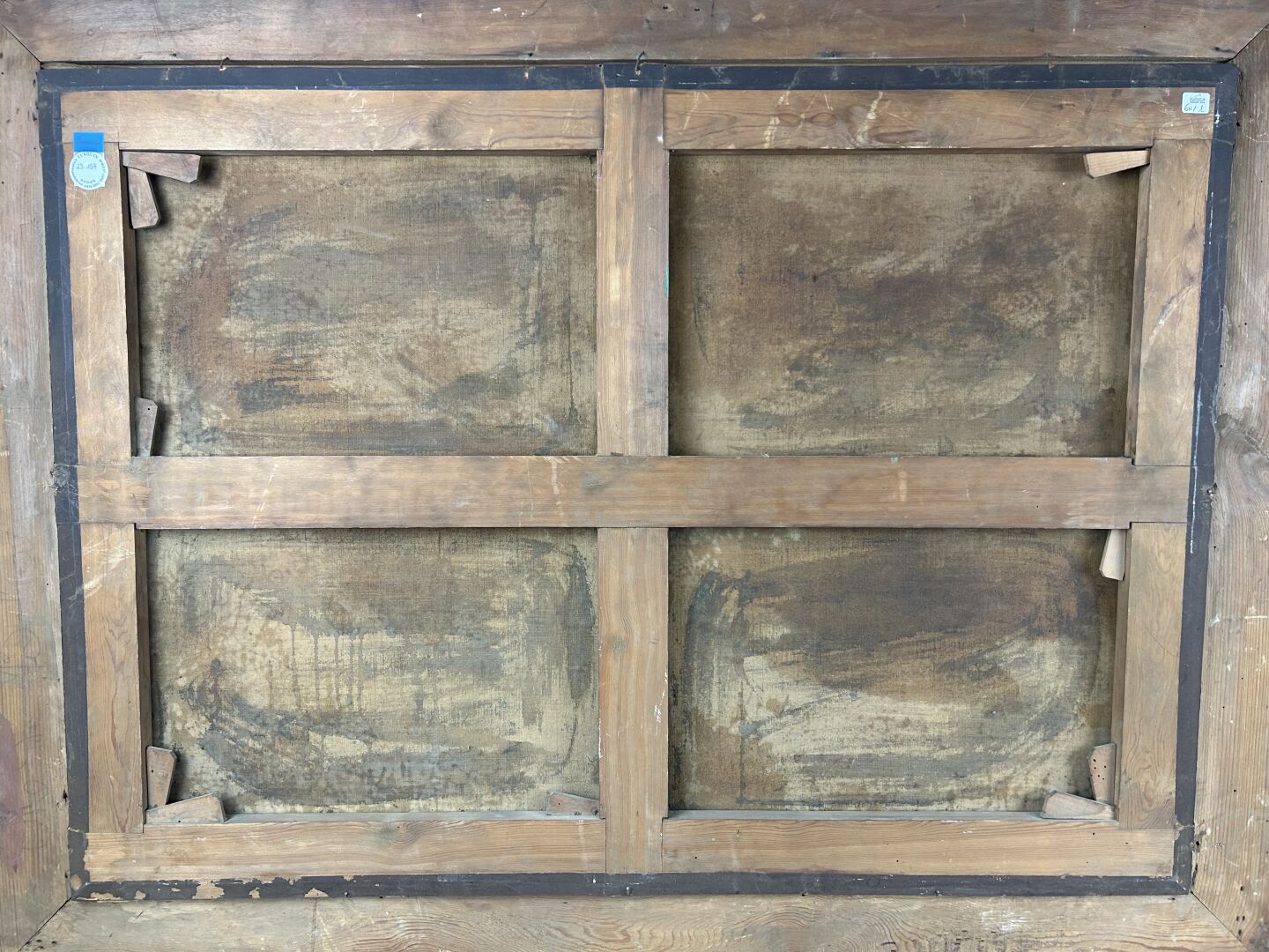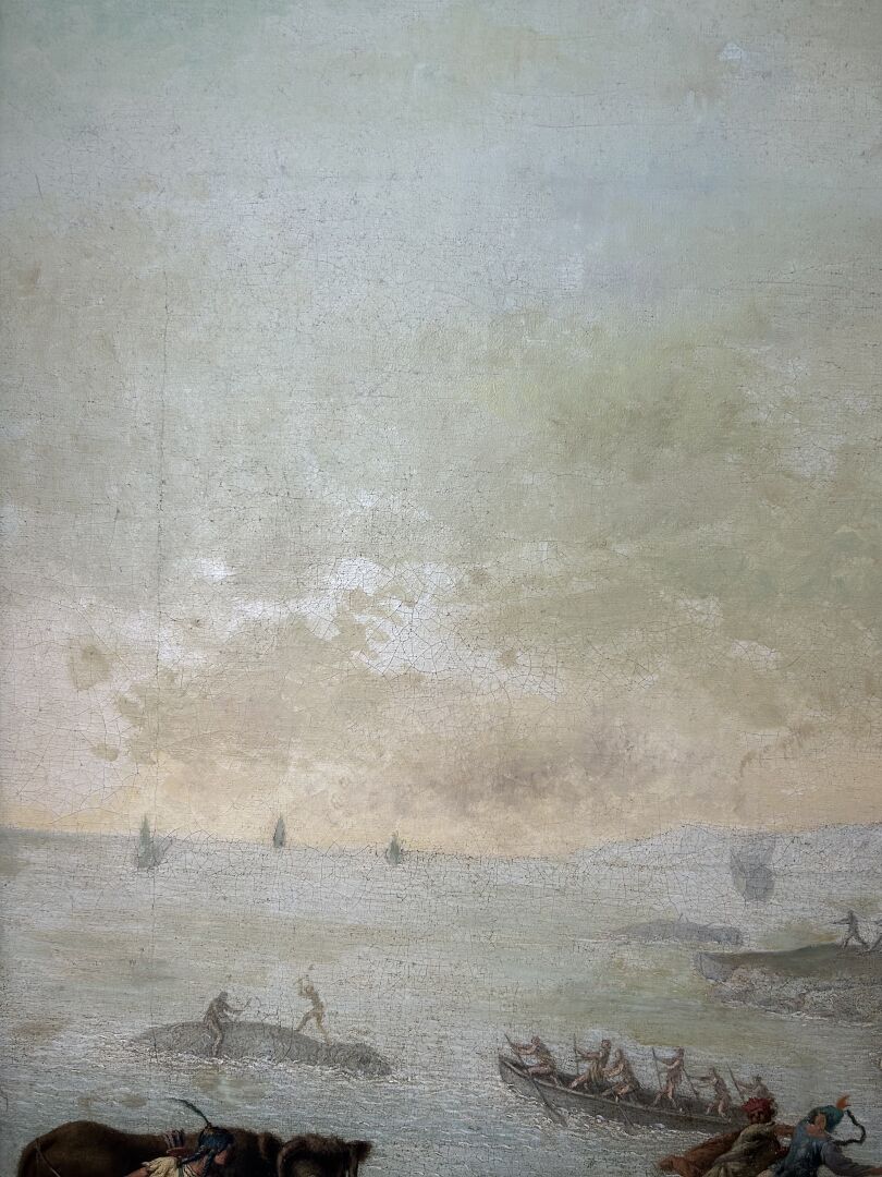 207 ESTIMATION: 3000 / 5000 € École Hollandaise vers 1700 Paysage lointain fantasmé, chasse à l’éléphant de mer à la Réunion Huile sur toile 70 x 100 cm Cadre en stuc doré XIX° (manques)