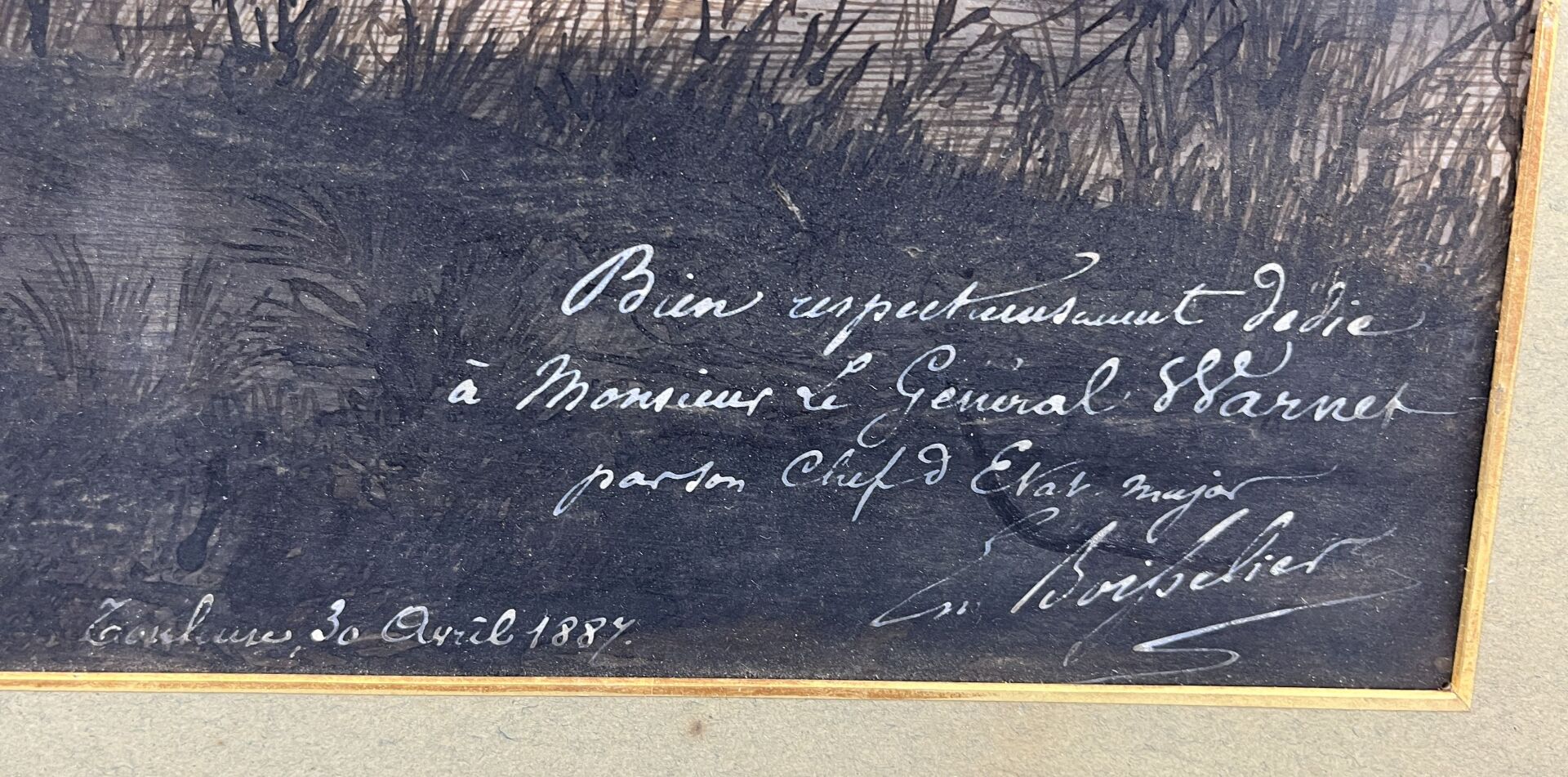 Encre et lavis sur papier, localisé et daté Toulouse 30 Avril 1887, titré en bas à gauche et dédicacé « Bien respectueusement dédié à Monsieur le Général WARNET par son Chef d’Etat Major E. BOIFSELIER »